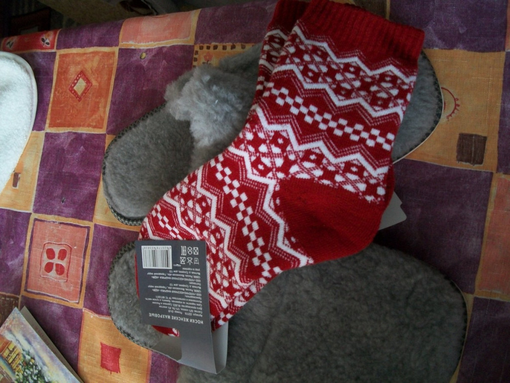 а еще Светочка позаботилась о том чтоб мои вечно мерзнущие ножки были в тепле и прислала шикарные новогодне-теплые носочки и такие же теплые шлепонки,чтоб как я и мечтала могла в них чуть ли не влетать с разбегу :biggrin:
