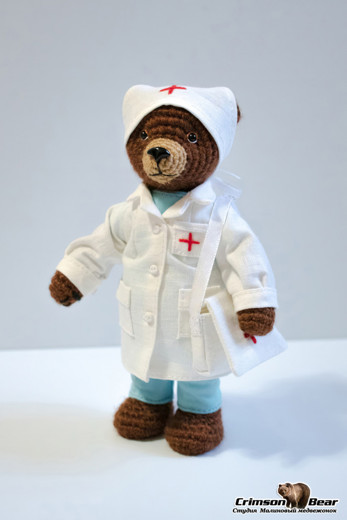 Мишка в медицинской форме, размером 15 см. Поворотная голова на шплинтовом креплении, подвижность лапам придает каркас из медной проволоки. Пуговицы, карманы и сумка функциональны.