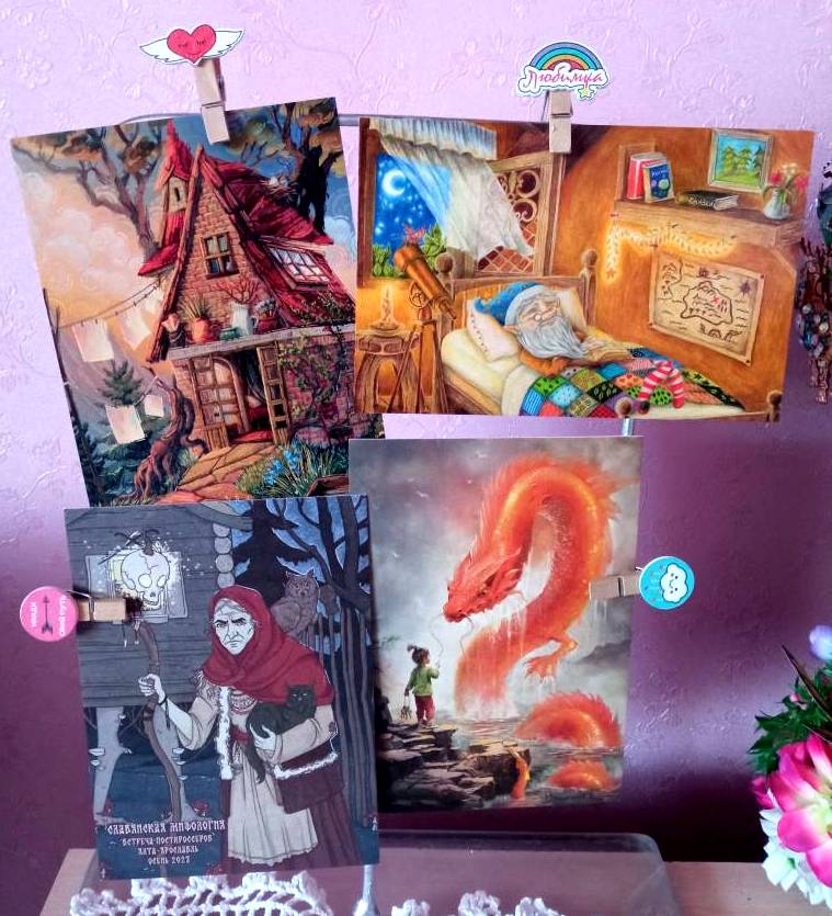 Э -Элегантный возраст, Ш -Шарлотка, и еще Открыточка -славянская мифология (Встреча посткроссеров, обалдеть :good: ), а еще в коллекцию открыточки с домиком, дракончиком и гномиком :toy: И как же красиво все оформлено :bravo:
