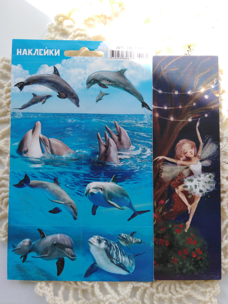 А еще там была открытка с земляникой/лесной клубникой/глубяной (во сколько названий у ягоды), наклеечки с дельфинами и закладка. :reverans: