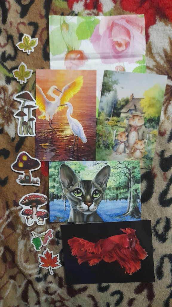И сюрпризные открыточки, наклеечки и очень красивая салфеточка