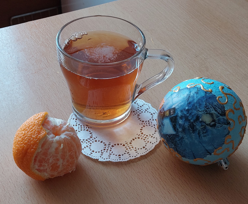 Напиток - чай обыкновенный с мандариновыми шкорками, и вот кружечку себе прикупила праздничную. чтоб повеселее было.