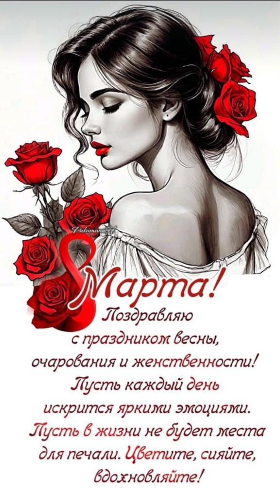 Девочки мои дорогие, с нашим девчачим праздником нас, с праздником Весны 🌷Пусть всегда сияют ваши глаза, свежий ветер несёт только приятные перемены и аромат цветов окружает вас, не давая забыть, что вы-Девочки! Самые нежные, самые добрые, самые мечтательные, самые звездопадные, железные ручки в бархатных перчаточках, вы-необыкновенные, каждая из вас-Чудо!