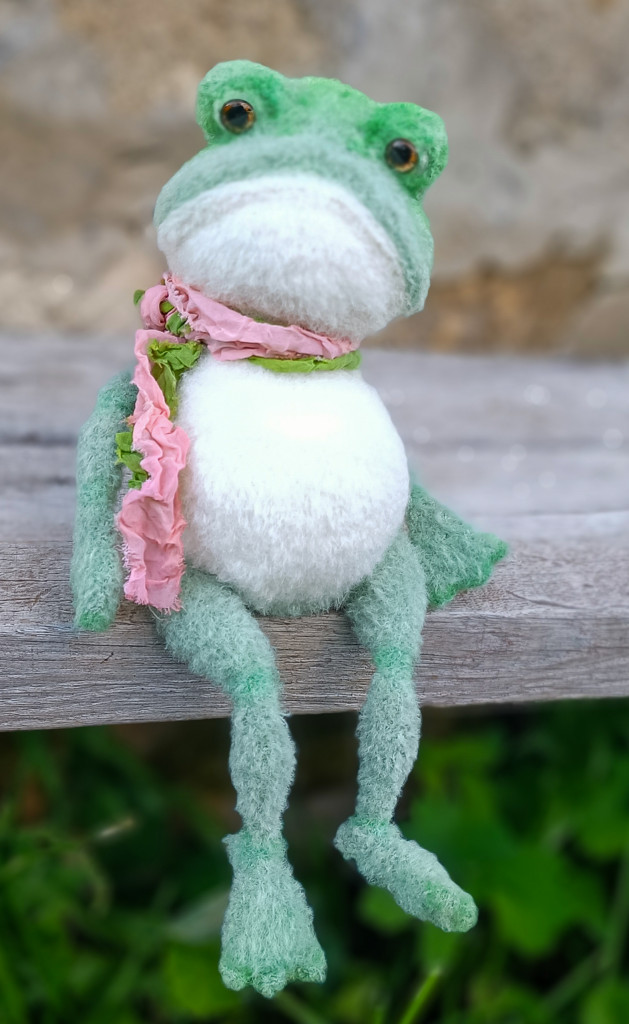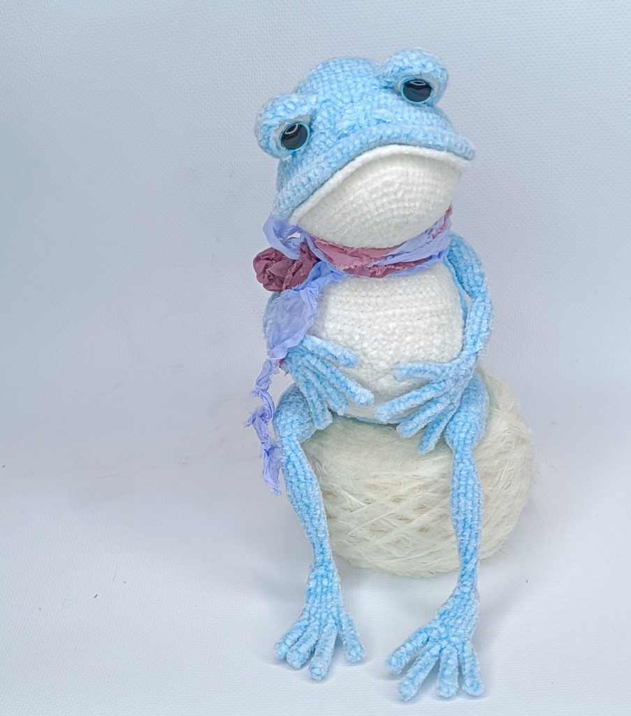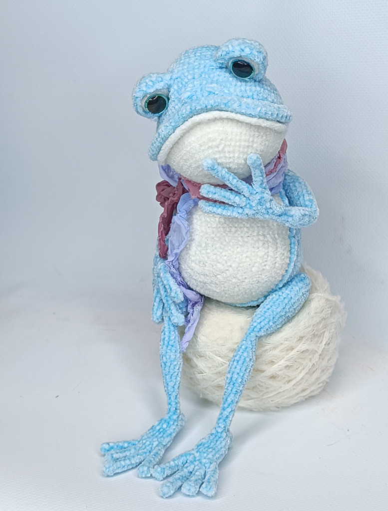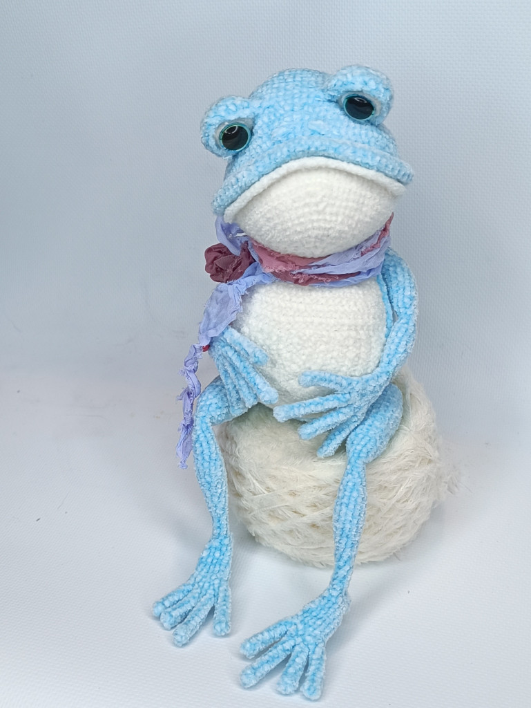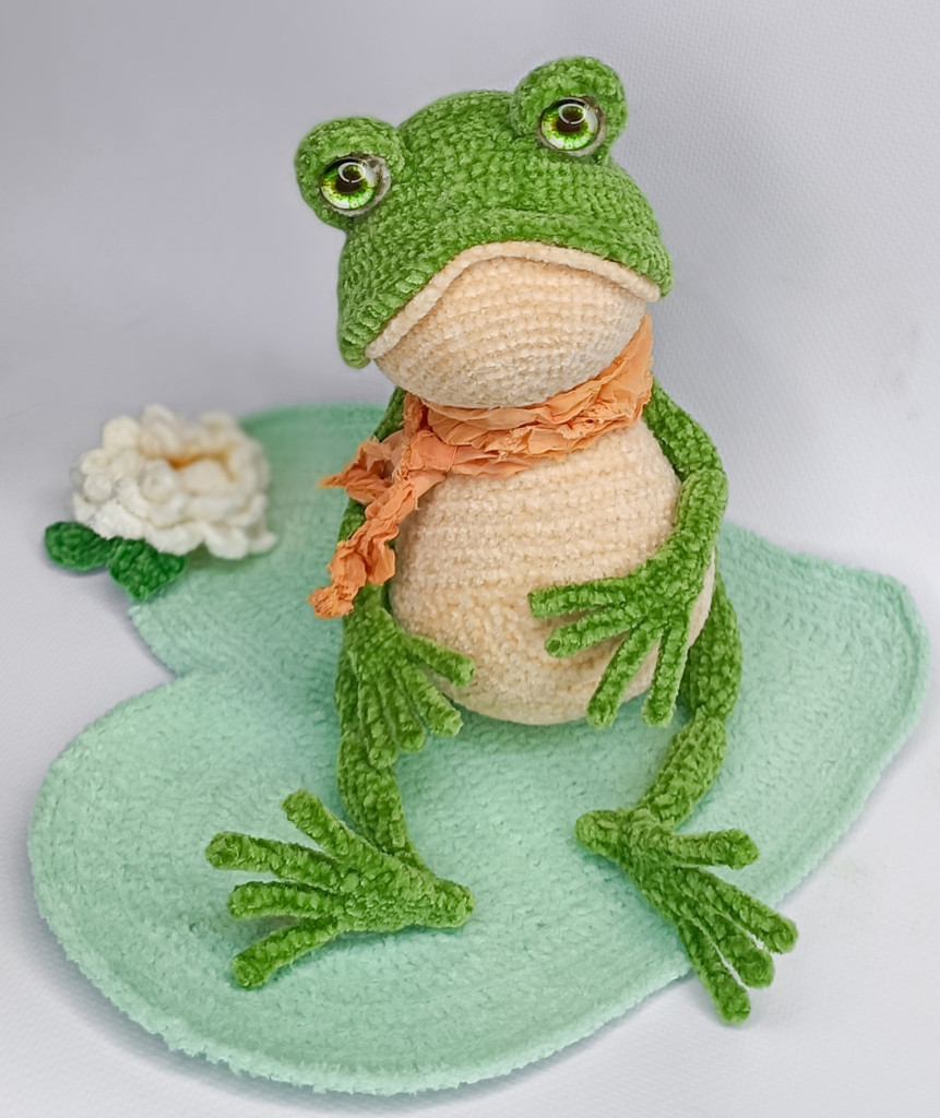 И вот еще одна лягушка, больше как демонстрация того, как делать не надо и лучше выбирать указанные нитки. Эта лягушенция вымотала мне все нервы и все равно не получилась такой, как я хотела и задумывала. В общем, примите к сведению, что из фактуры типа любой меховушки у вас получится вот такое странное существо)