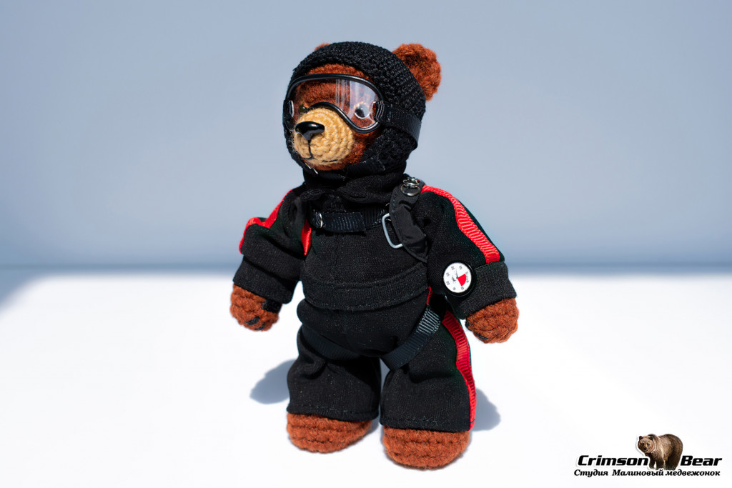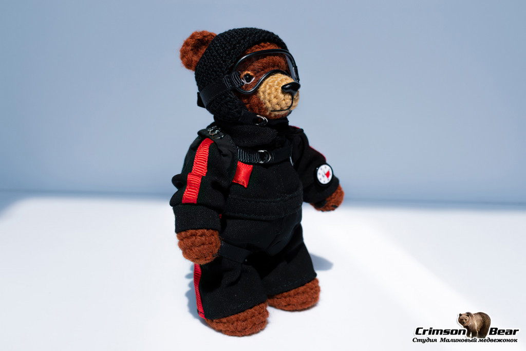 Мишка парашютист в черно-красном комбинезоне и с черно-красным ранцем.
