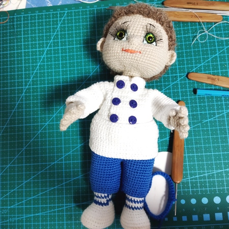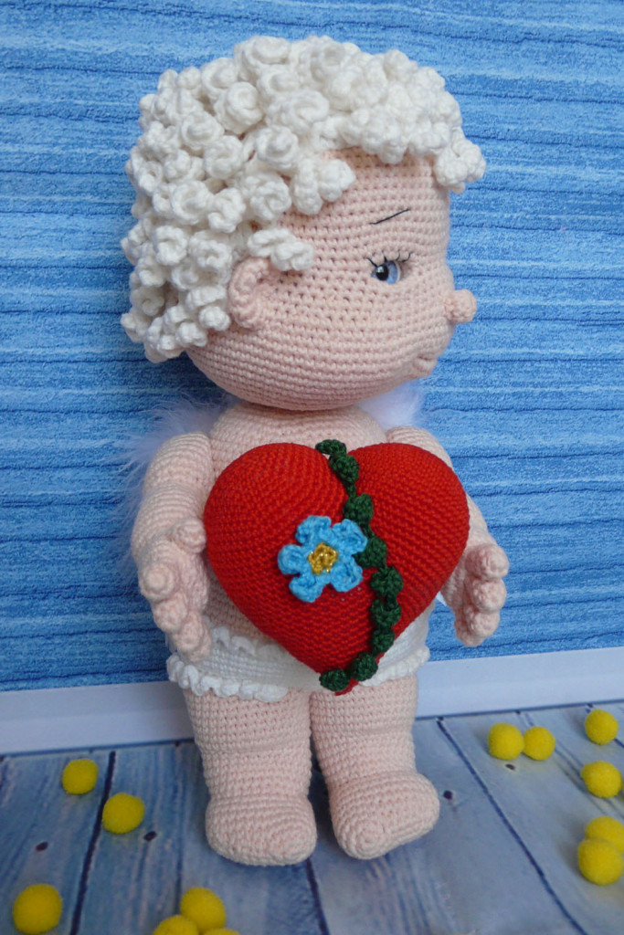 Серафим связан в онлайне с Анной Садовской. Ручки и голова на суставах + проволочный каркас. Цельновязанный, без утяжек. Пряжа Gazzal Jeans. Рост 28 см.