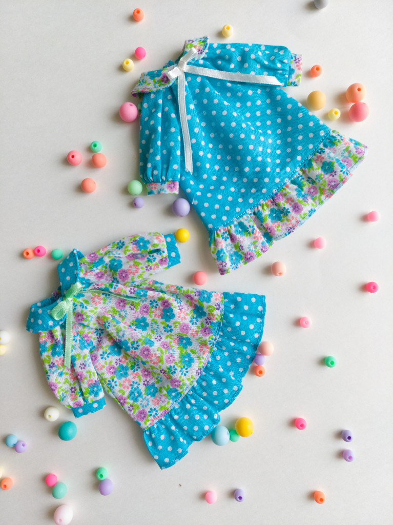Первая фотография — это само платье (забыла сфотографировать сразу, сделала это, уже когда отрезала нижнюю часть). Из нижней части сделала юбку. На второй фотографии — верхняя часть платья (из деталек спинки сделала карманы на юбку, из переда — кукольную юбку, из воротничка — украшения для карманов). На третьей фотографии — рукава от платья (из них сделала комбинезончик). А под чертой — получившиеся вещички.