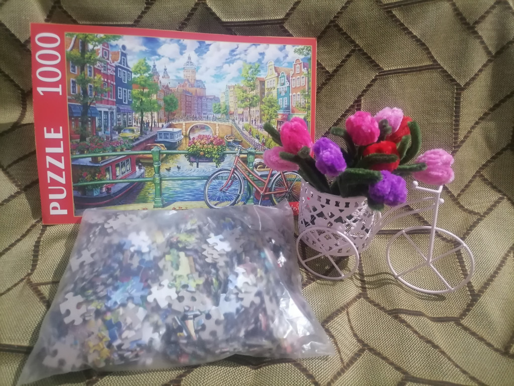 Мои любимые паззлы называются "Канал в Амстердам", велосипед для фотосессий(я мечтала втайне о таком) и тюльпаны!!! Какие они шикарные!!! набор для творчества "Голландии", чайные домики. нужности и вкусности