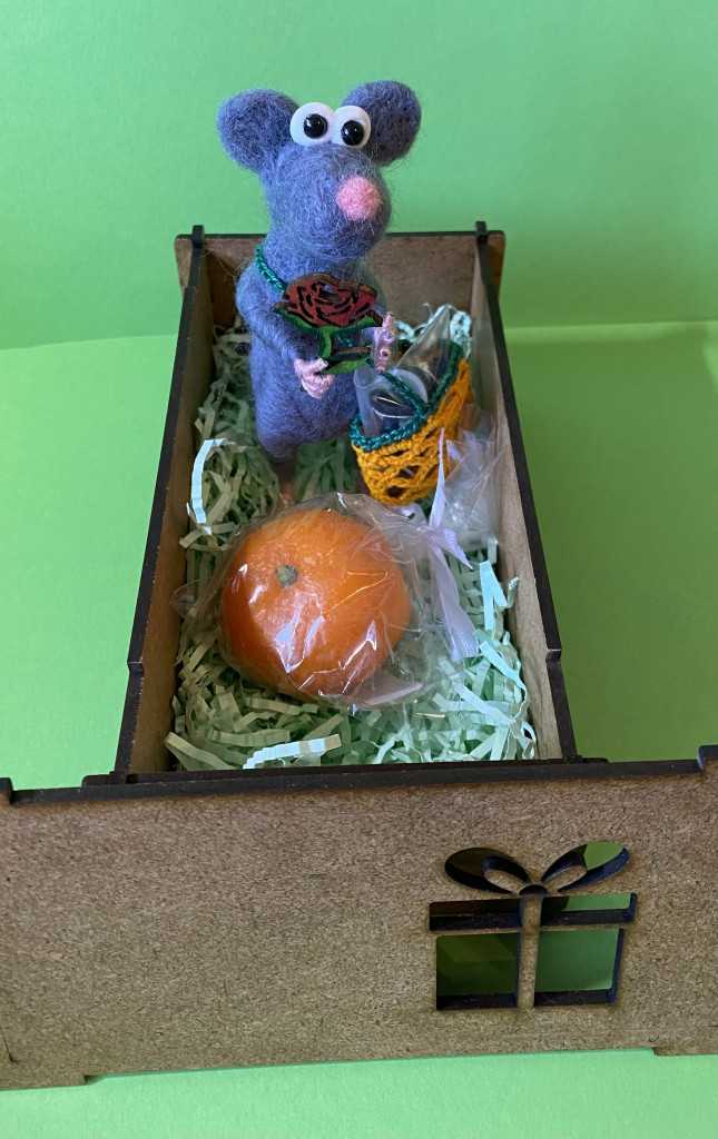 Получила посылочку из Австралии от Марии Базиной с австралийским сумчатым МЫШем. Миниатюрно изящным, в собственном домике с множеством подарков. Бережно держит тонюсенькими пальчиками цветок и мне аж стыдно, я опустошила его ажурную австралийскую сумочку с подарочками. Мыш крохотный, такой весь валяно-шерстяной, стройняшка с любознательным веселым взглядом, просто бесподобен! Пряжа сногсшибательная - и меховая и Дива, ботиночки, глазки, мандаринчик, кондитерская посыпка, блестки для дочери, много вкусностей и наполнитель (строго для эксклюзивной игрушки - редкостный). Мария, спасибо за праздник, за душевное письмо, Мыша уже люблю, с кошками познакомила, все в восторге. Наташа, спасибо за познавательный обмен!