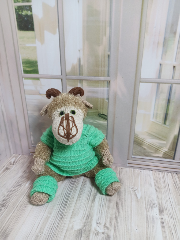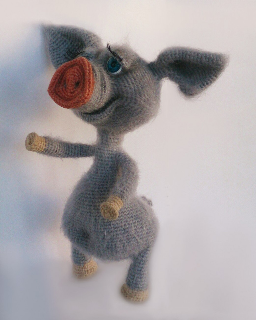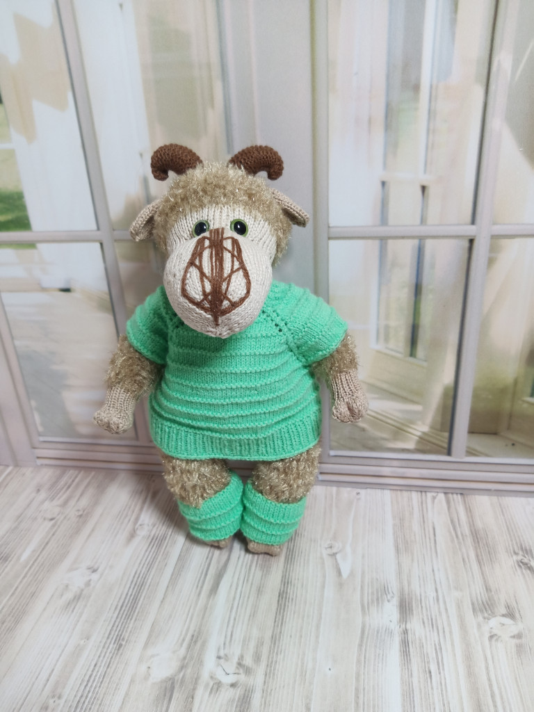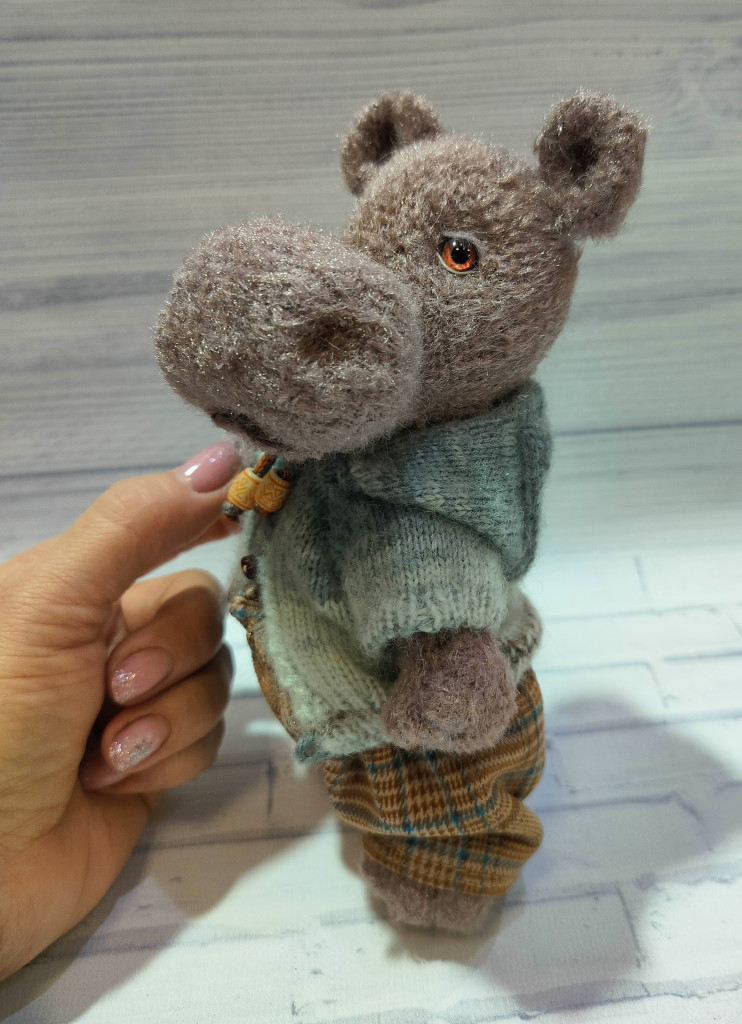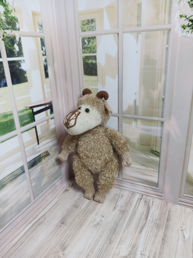 Связан из айсовской турецкой пряжи "бразилия" с добавлением кидмохера. Рост 18-19см. Лапки и голова на шплинтовом соединении, уверенно сидит, стоит с опорой.