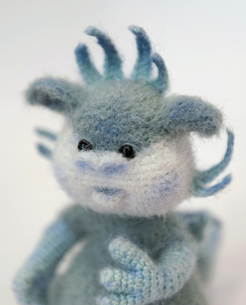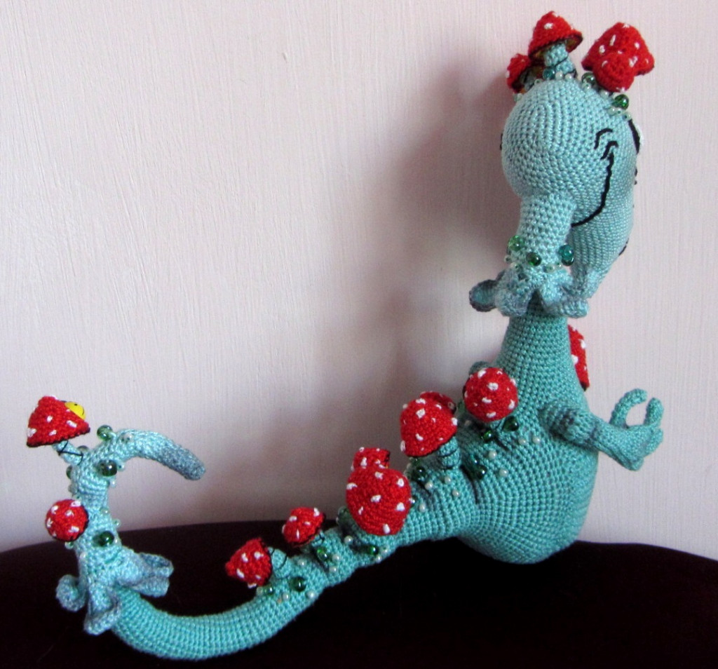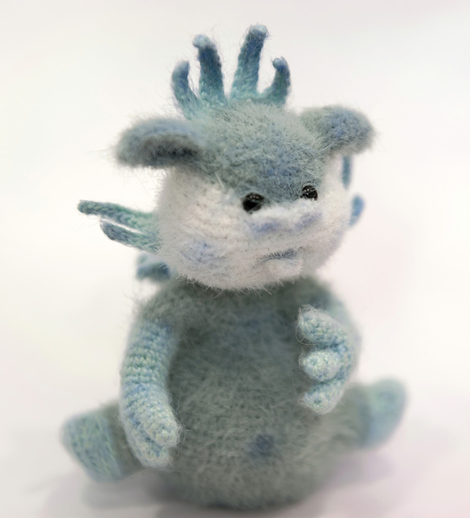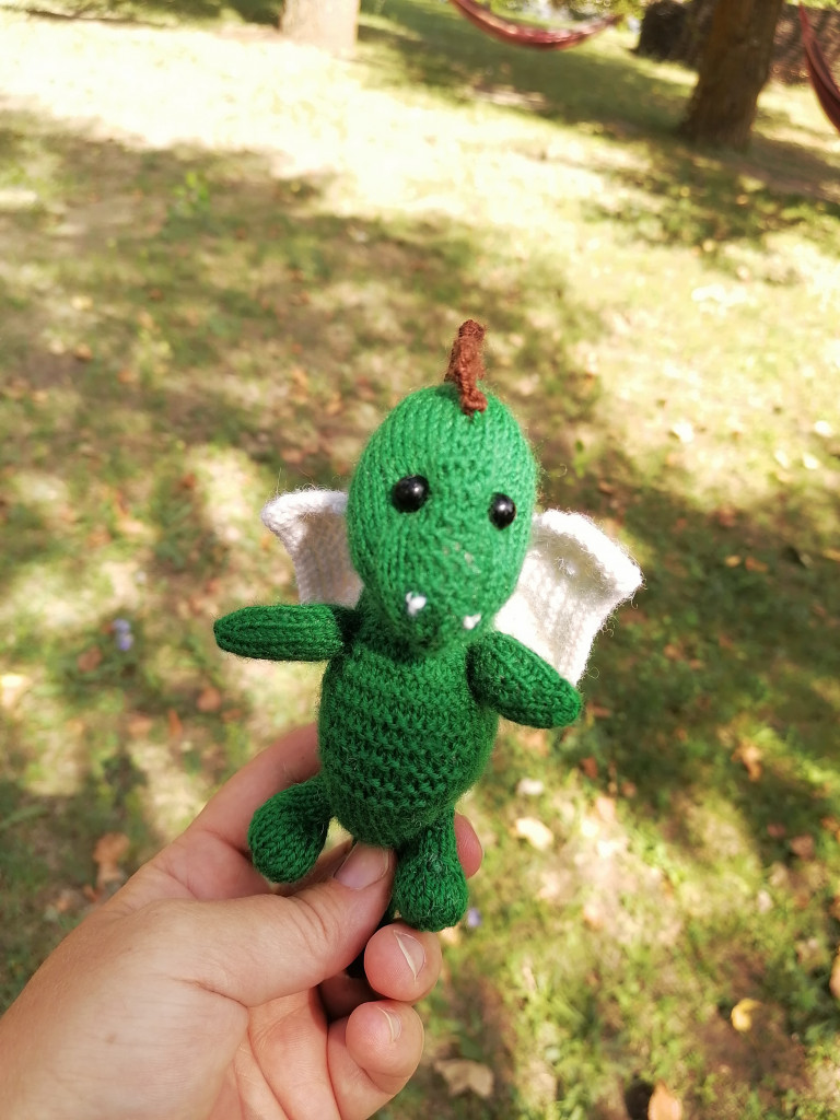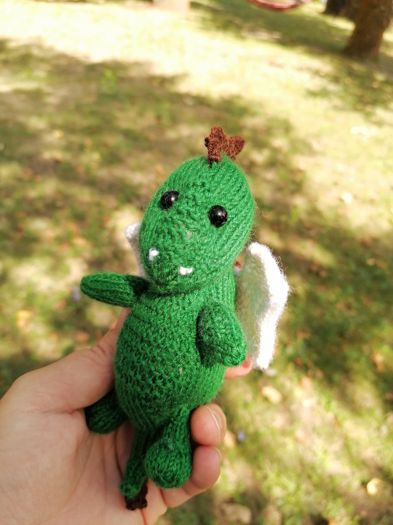 Из последних, как раз то что сейчас модно. Дракоша-кроха, связанный в технике поворотные ряды на совместном вязании