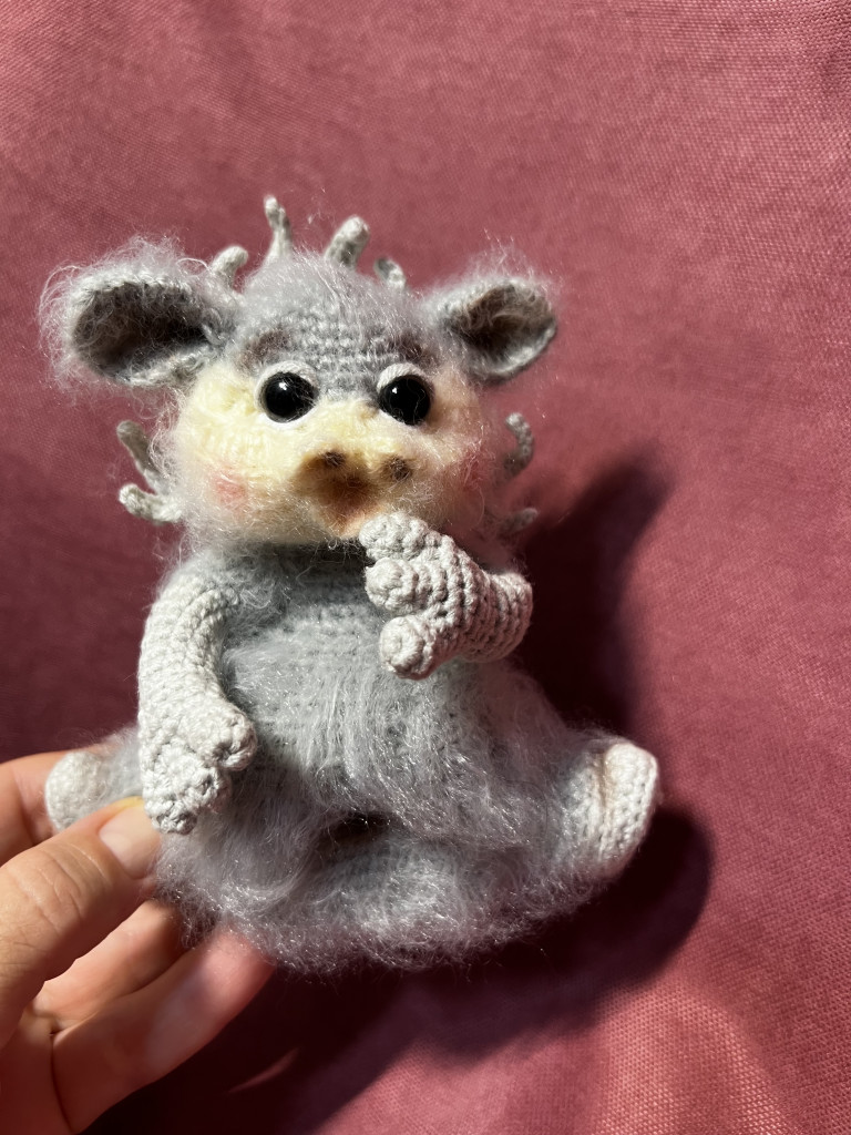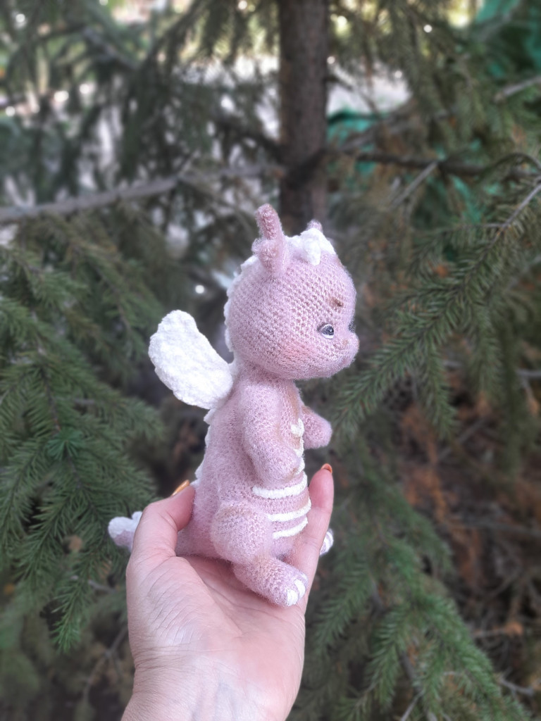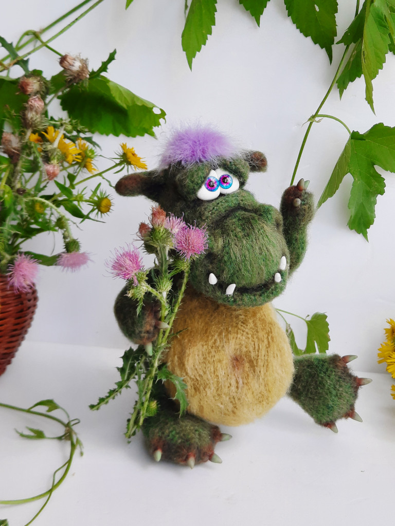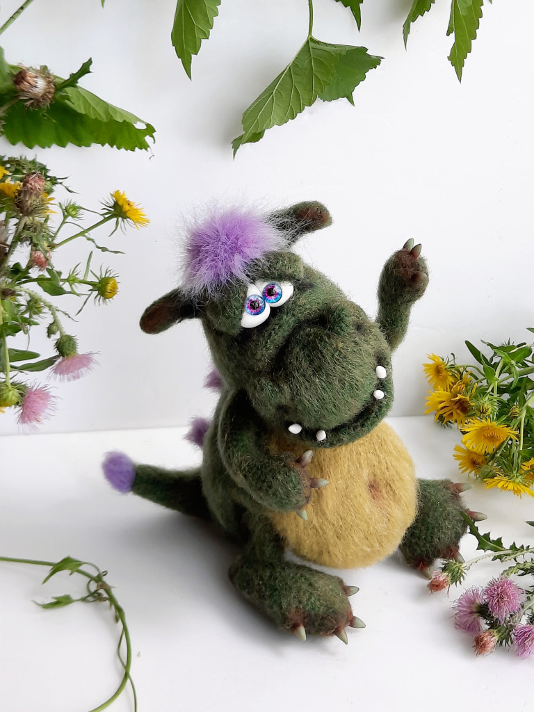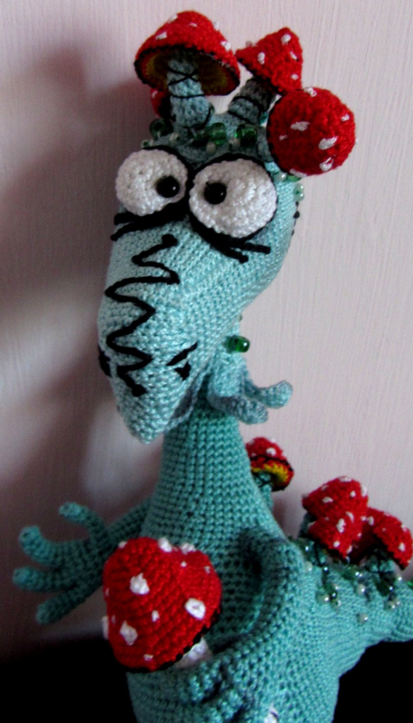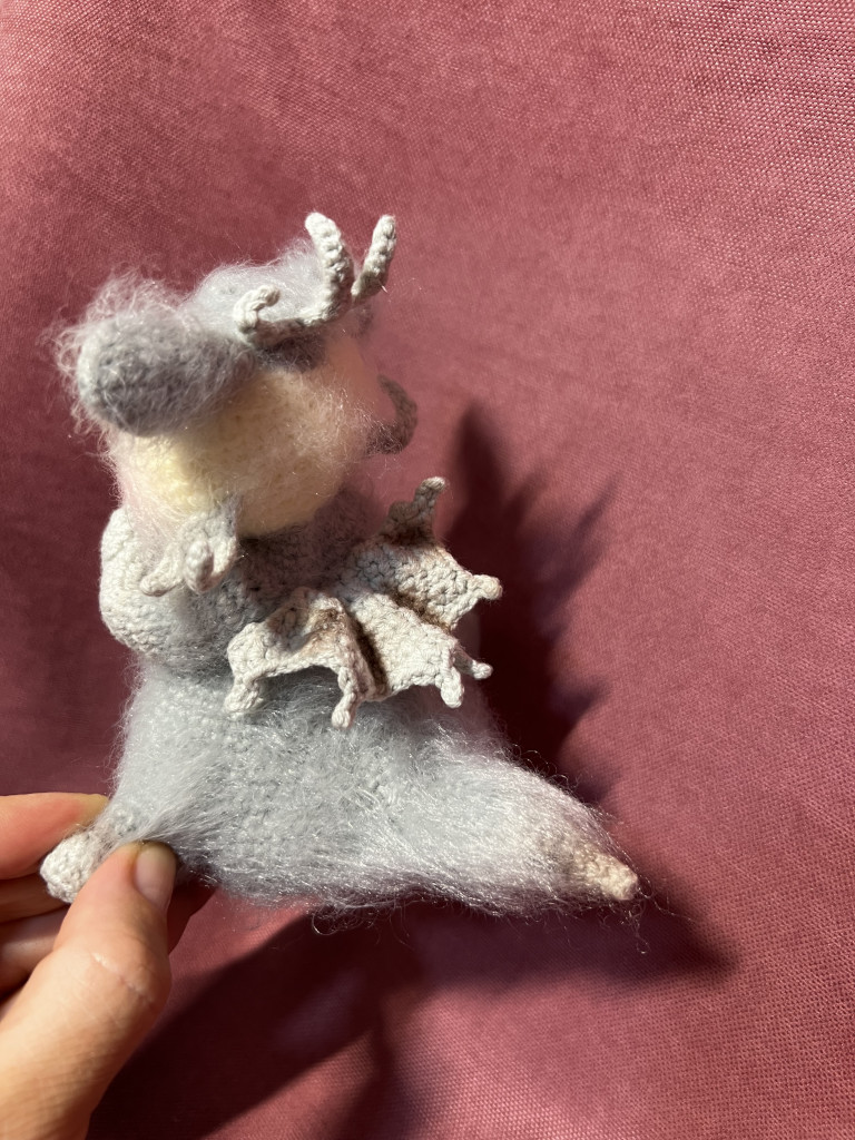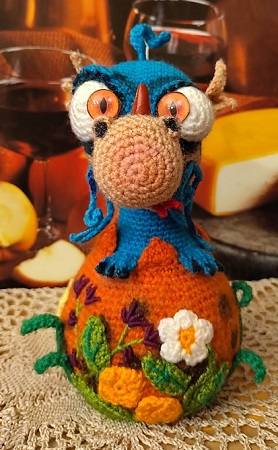 Из последних, как раз то что сейчас модно. Дракоша-кроха, связанный в технике поворотные ряды на совместном вязании