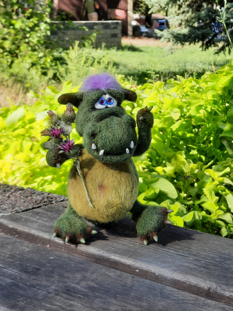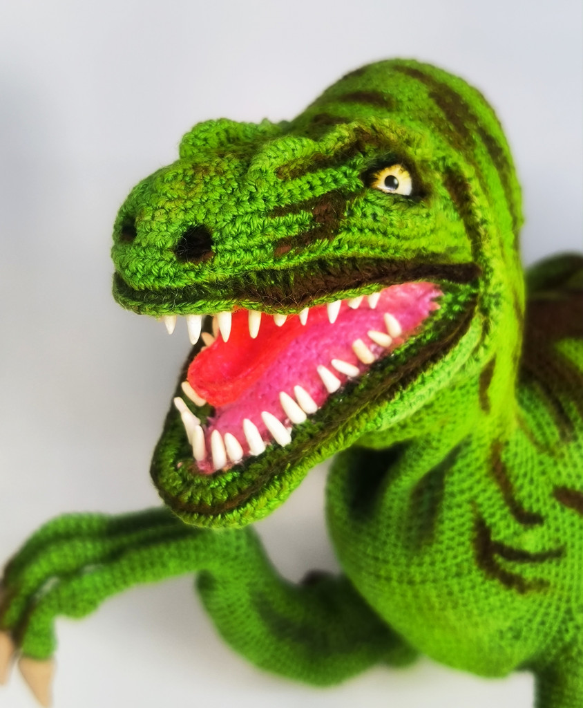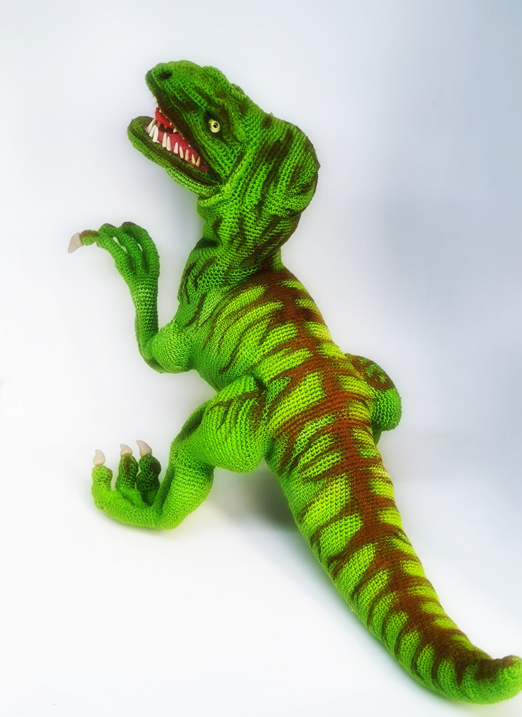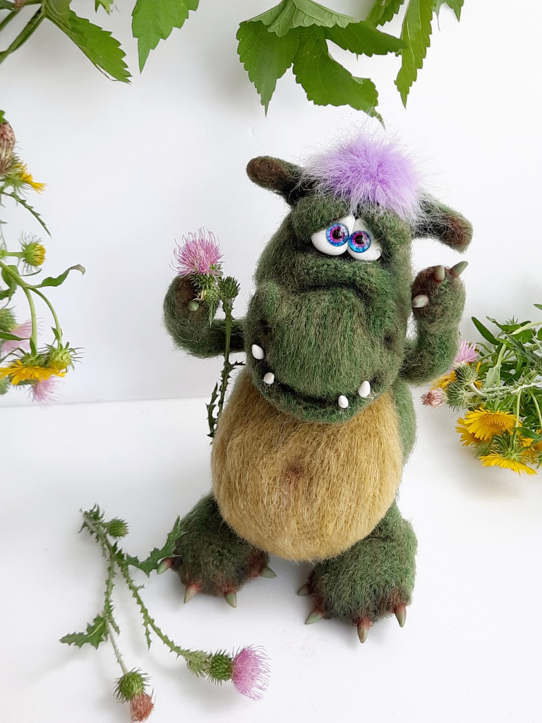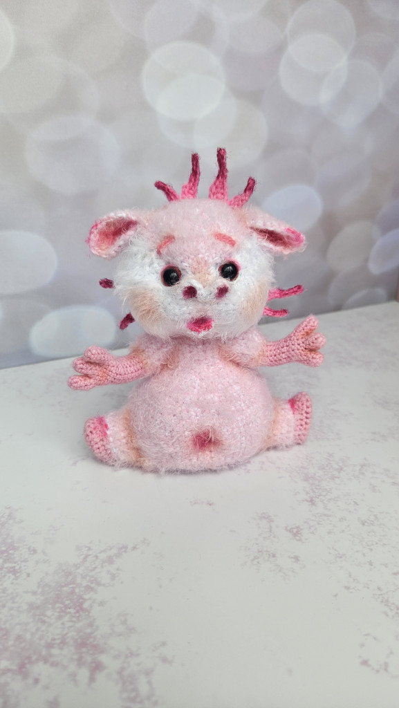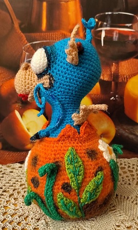 Из последних, как раз то что сейчас модно. Дракоша-кроха, связанный в технике поворотные ряды на совместном вязании