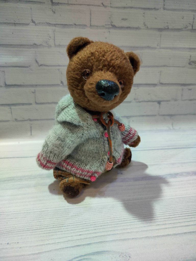 Мишка связан в школе миниатюрной игрушки Натальи Косовой. Размер мишки около 10 см., голова и лапки на нитяном креплении, глазки пластмассовые бусины, носик и пяточки из полимерной глины, тонировка выполнена маслеными красками.