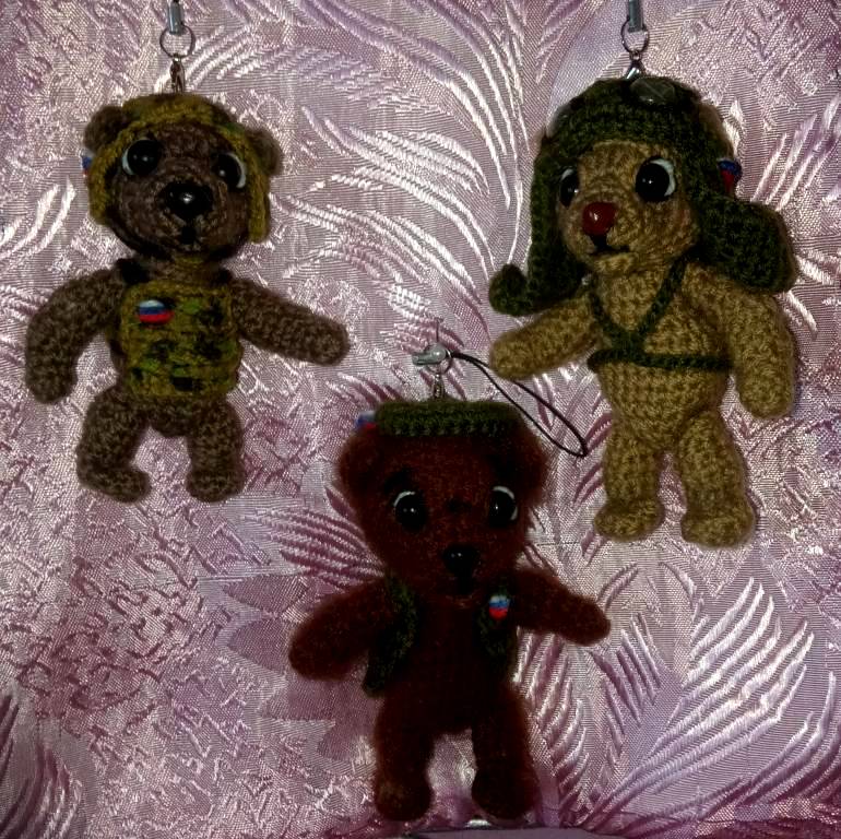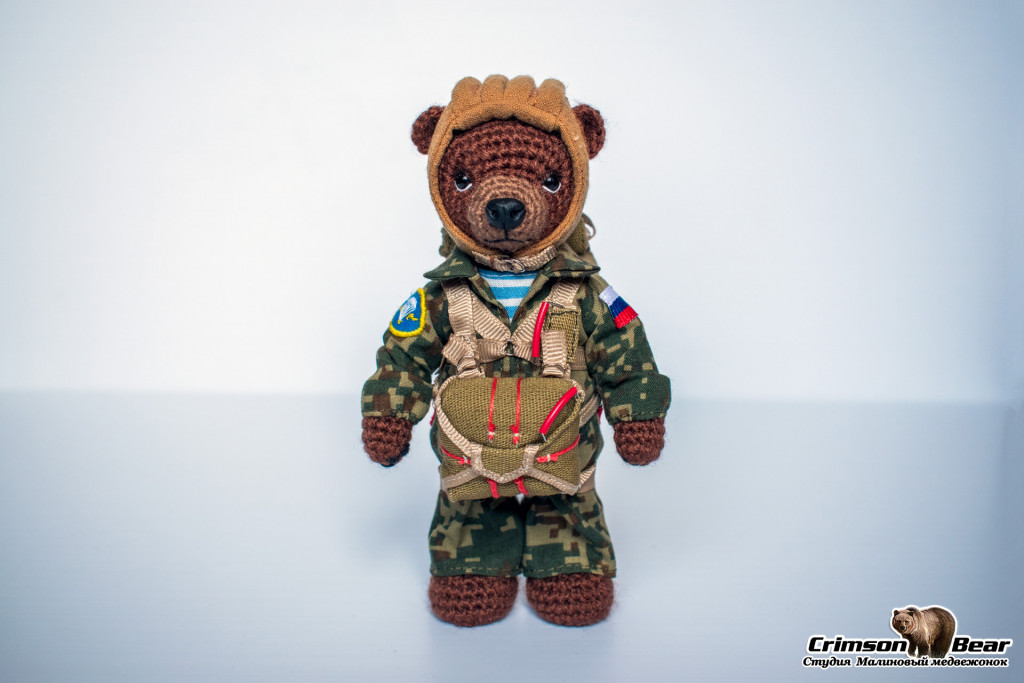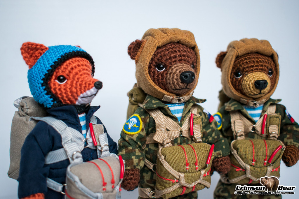 Связаны из акриловой пряжи, лапки на меднопроволочном каркасе. Экипированы парашютными системами Д-6. У медведей нашивки ВДВ.