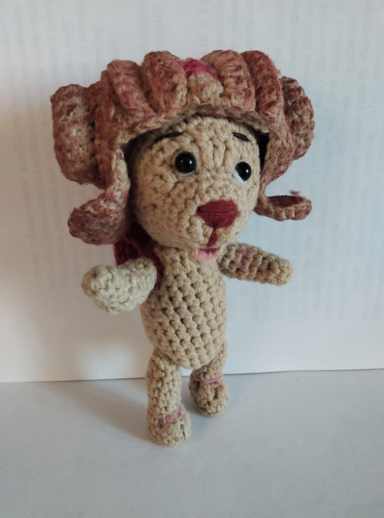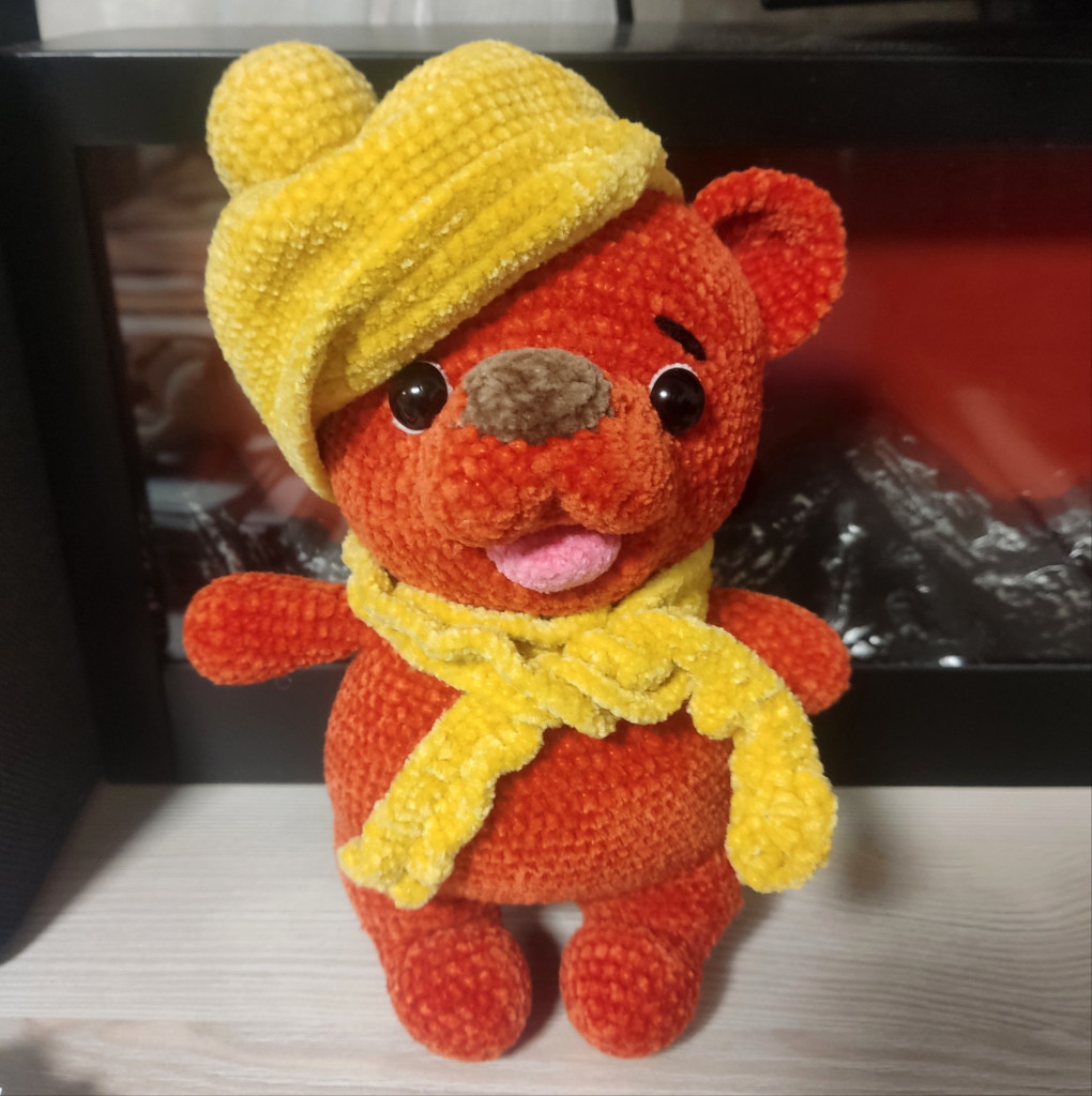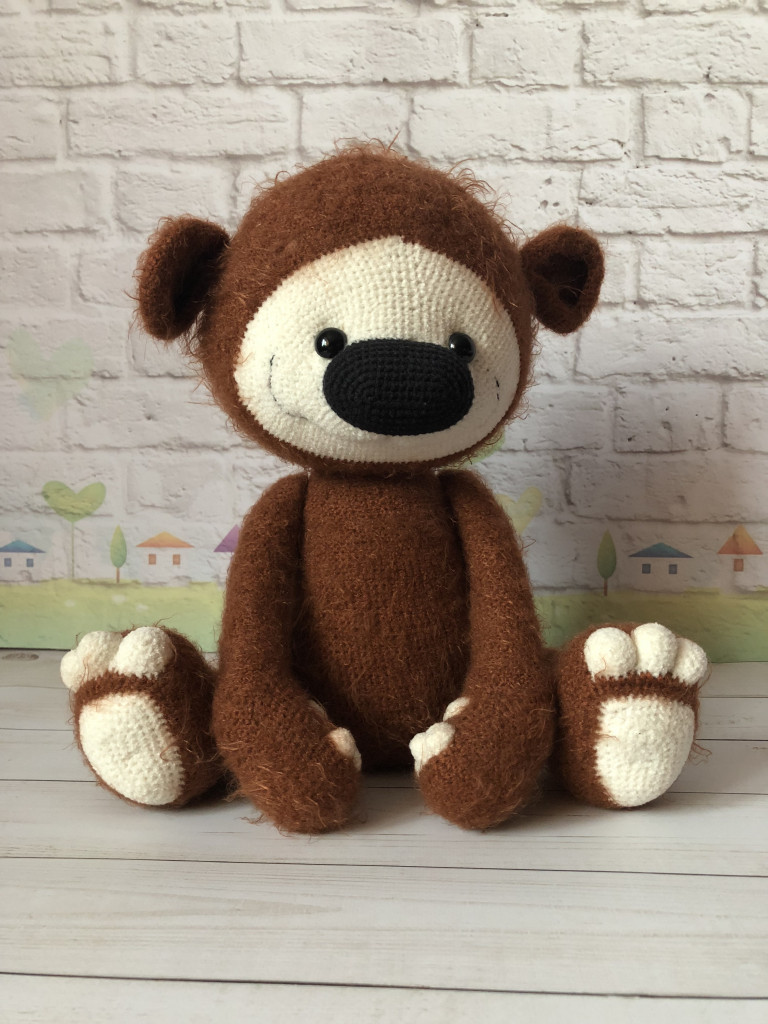 Михасик, спасибо Светлане Комаровой. Связан крючком из пряжи аделия велюр, на шплинтах. Размер стоя - 16см, сидя - 14см.