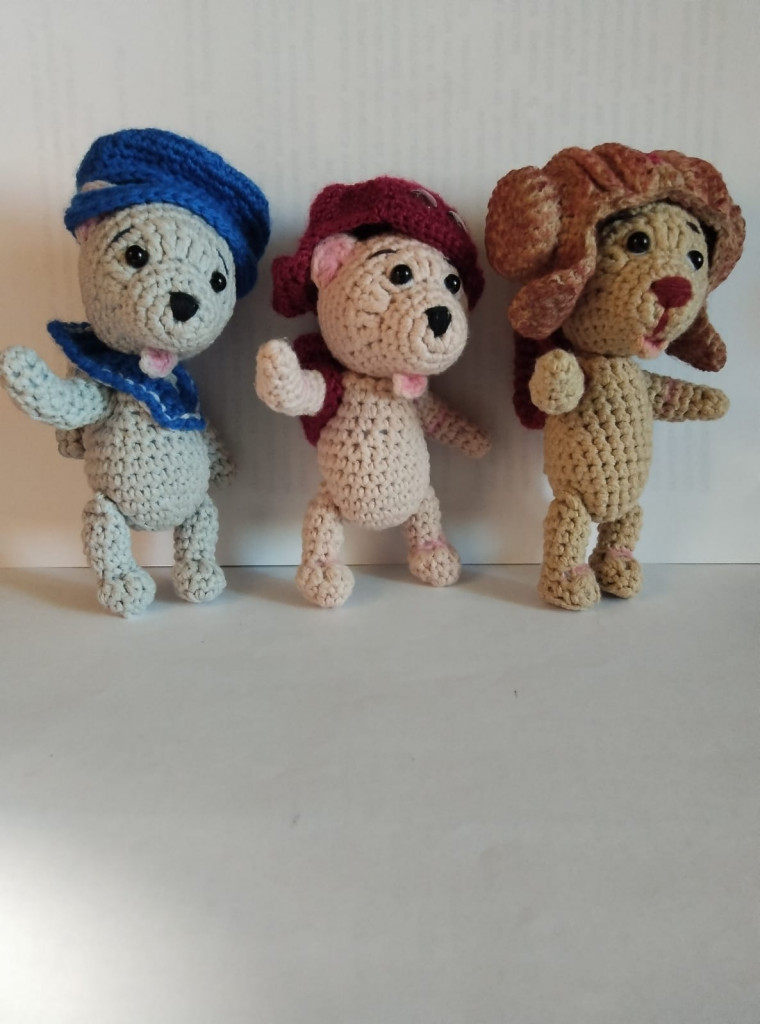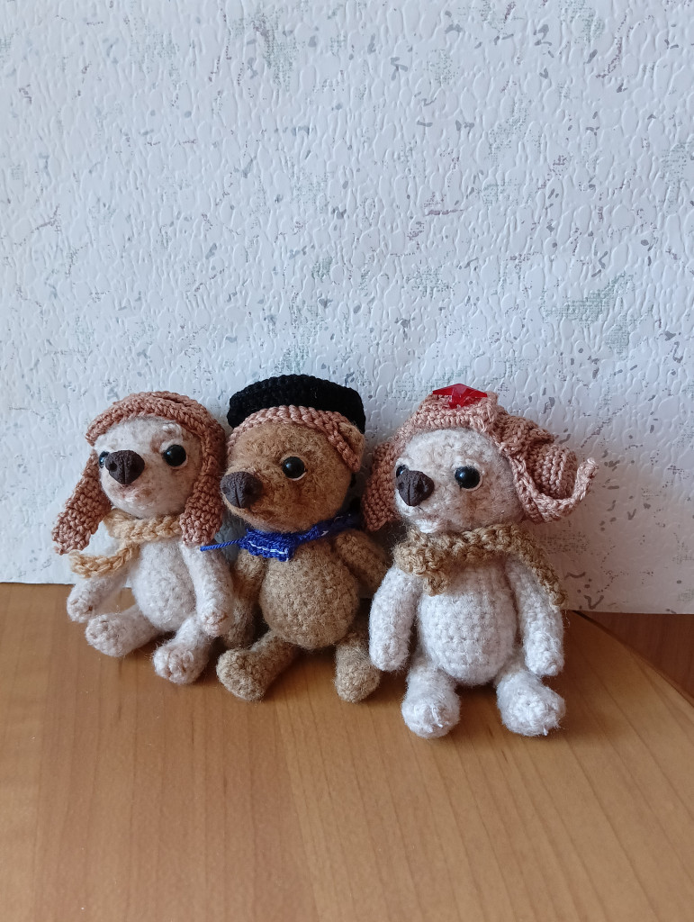Связаны по одной схеме, но разными нитками. Лапки и голова на шплинтах.