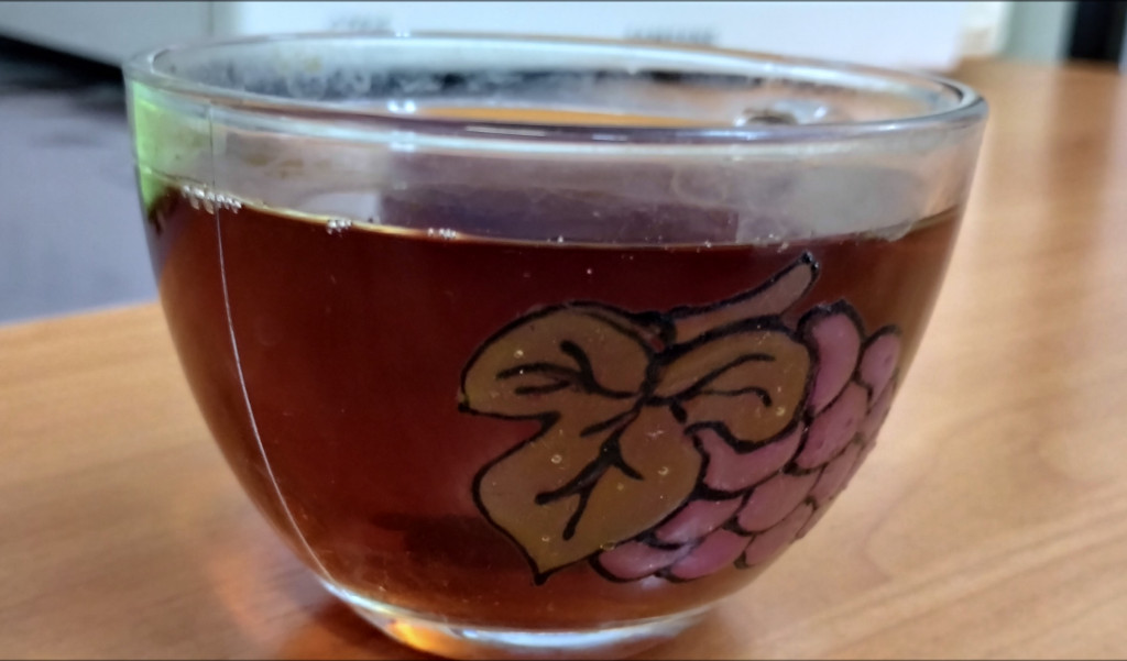 Выполняю задание: чай микс, заваривается впервые -- иван-чай собственноручно собранный и высушенный (ферментированный) + анчан + лемнограсс. Для полноты эксперимента был добавлен еще один ингредиент -- мандарин (в сам чай сок, в качестве украшения -- долька, пыталась красиво сфотографировать "заплыв" оранжевого тельца на гладкой поверхности -- не удалось, пошел ко дну)