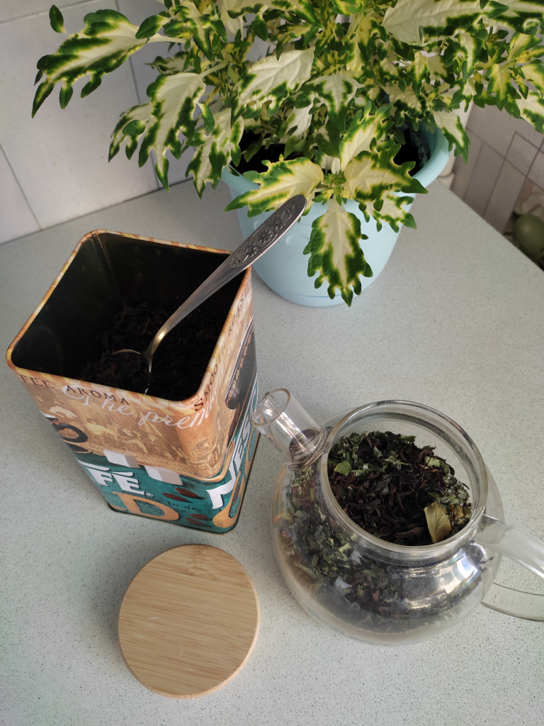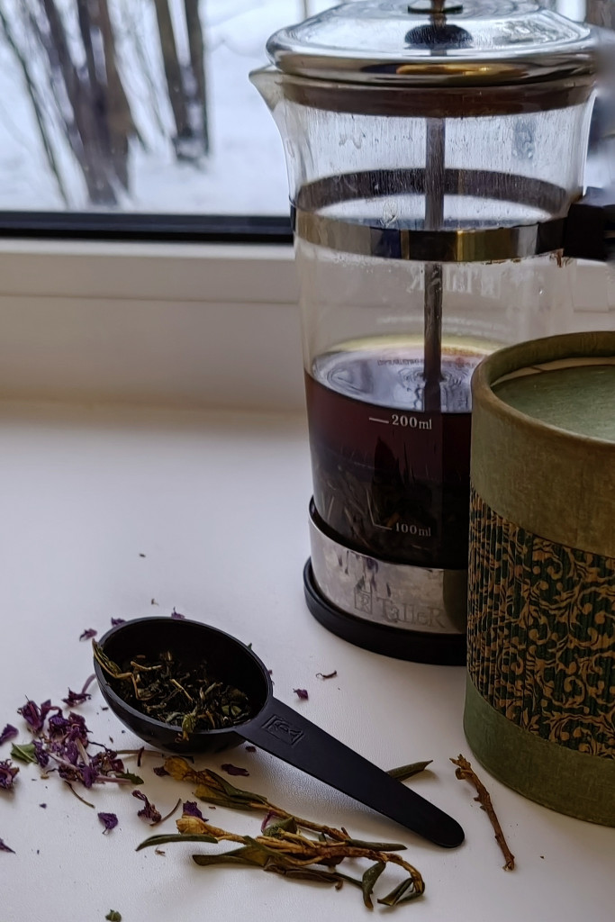 Добрый день! Я заварила чай из своих травок! У меня их много, сегодня решила использовать смородину, малину и иван-чай. Не стала добавлять мяту, мелису и чабрец, потому что недавно мне прислали новый ингридиент для чая - листья вишни, но не просто сушёные, а ферментированные - медленно высушенные в духовке! Они такие ароматные! Добавила немного чёрного листового чая, чисто травяной чай мы пьем только вечером, а это же дневной.