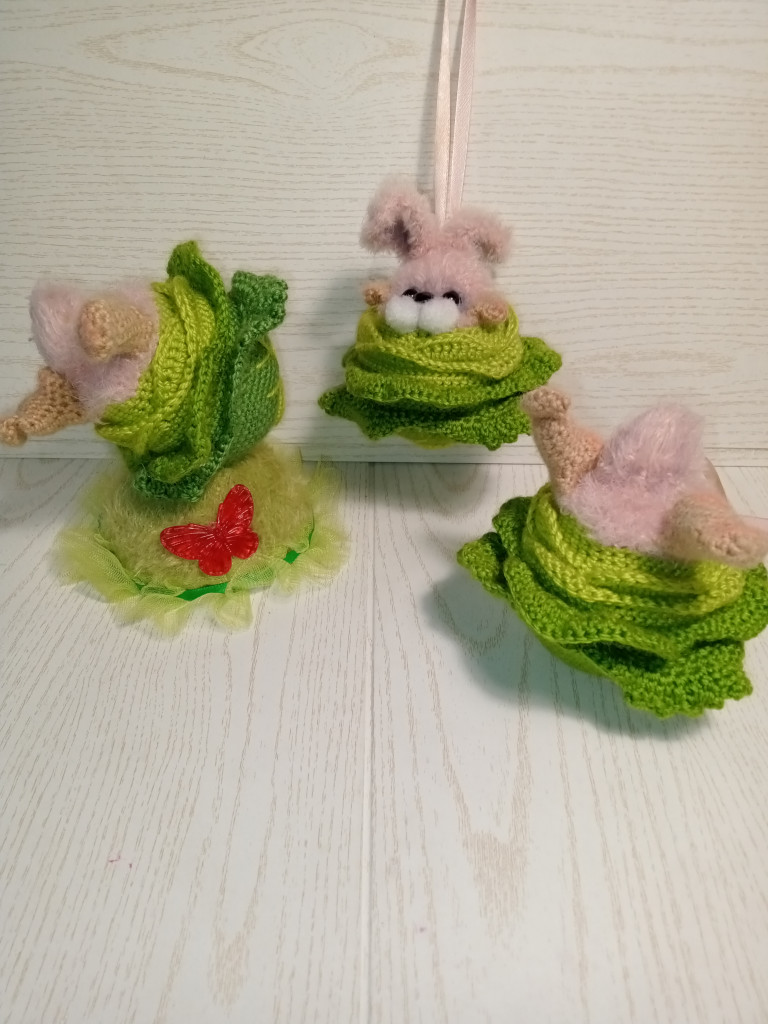 Когда-то давно у меня была гигантская мягкая мышь, а ещё раньше спицевый лежащий кот, и я давно мечтала навязать ещё таких же лежащих мягусиков. Таксу, лису, медведя... и вот благодаря конкурсу к мыши и коту присоединился заяц! И название придумалось - кабачки))
