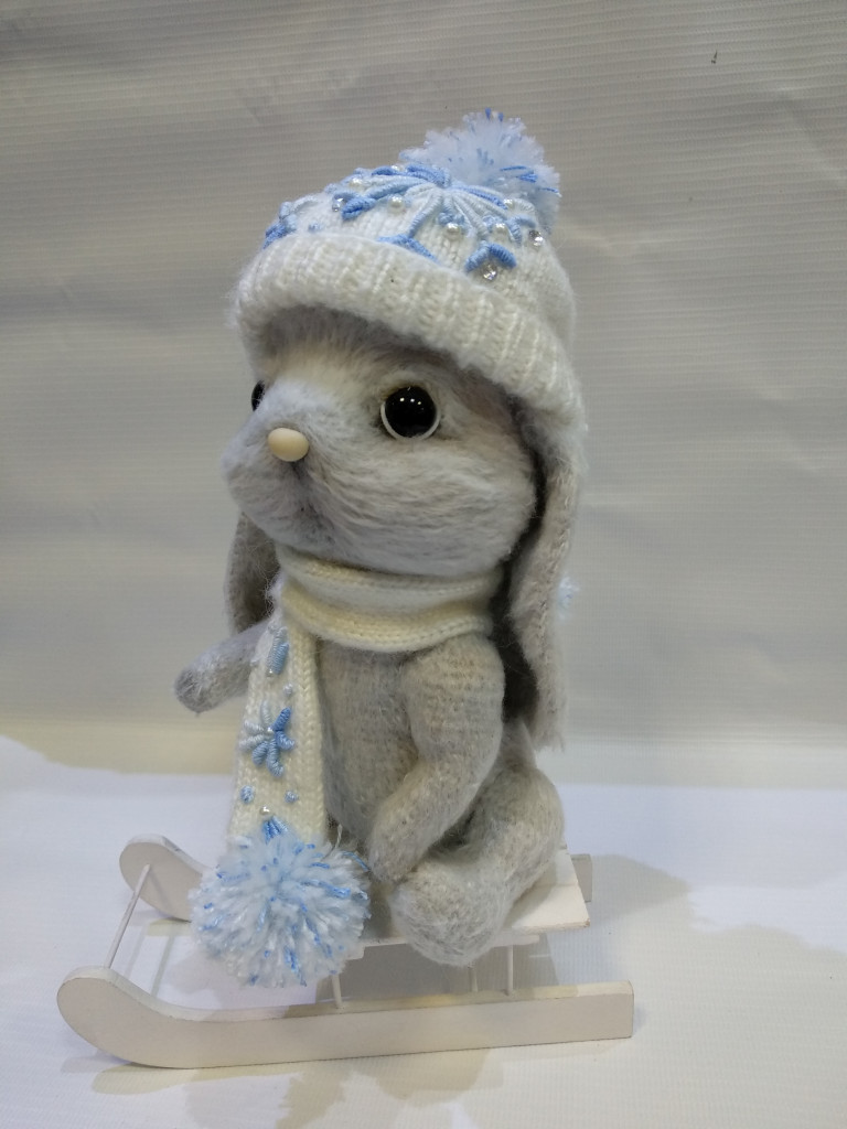 Зайка Пуфик, очень соскучился по зиме и с нетерпением ждёт снега, чтобы покататься на саночках.