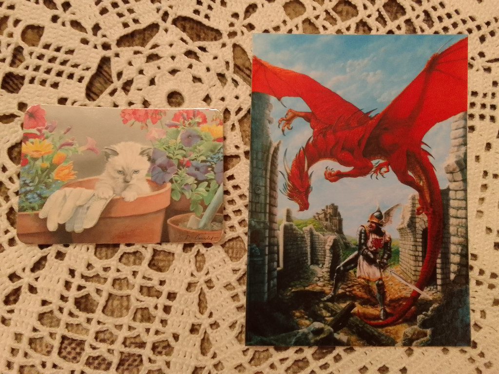 Открыточки мне и Лизе...обе попались Светочке :cheerleader: ...а ещё подарочки открыточка и календарик.эту открыточку Тихон забрал, и не просто забрал а вставил в рамку для фото, так она ему понравилась)) мы летом ездили в замок Гарибальди это под Самарой, настоящий средневековый замок с драконами..вот он и впечатлился... Светочка, благодарим тебя, очень рады и конверт в тему..