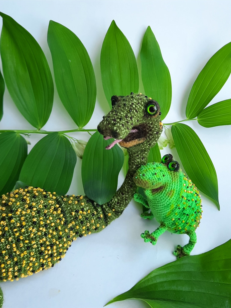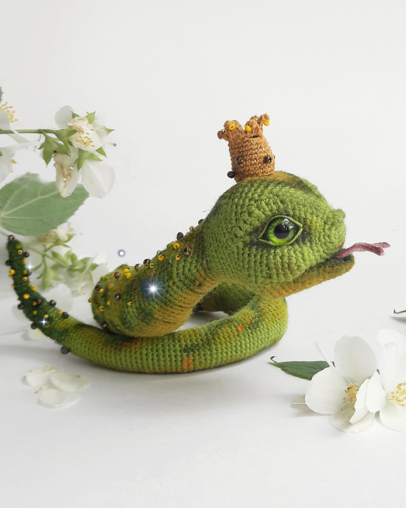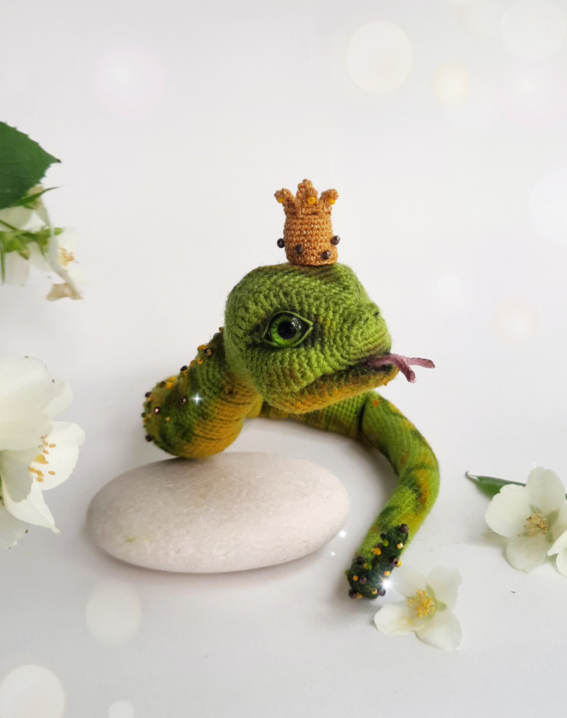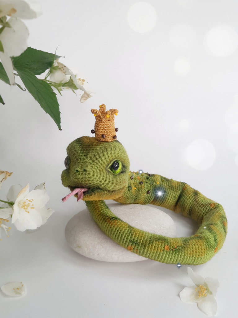 Использована пряжа Lana Lux 800 Himalaya в 2 нити. Длинна змейки 41 см. Тонировка - акрил. Украшена бисером и стеклянными бусинами. Глаза -стекло 10 мм.