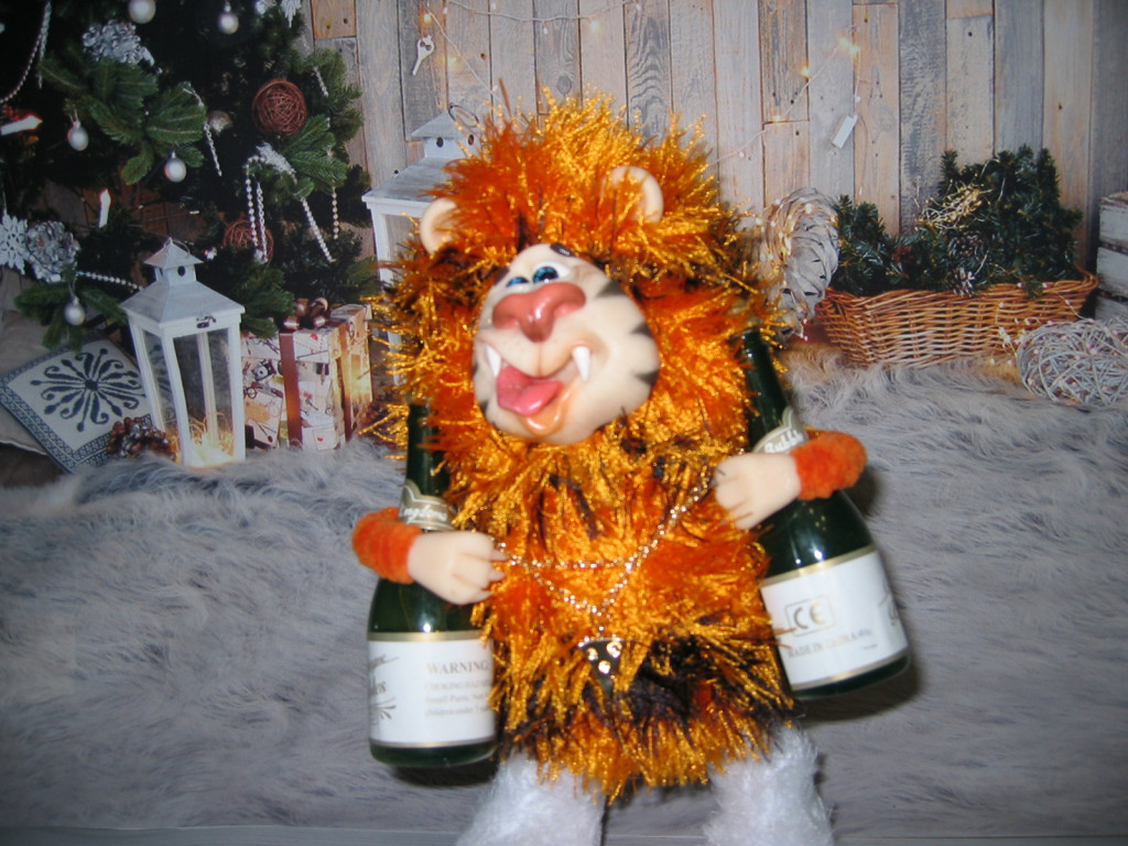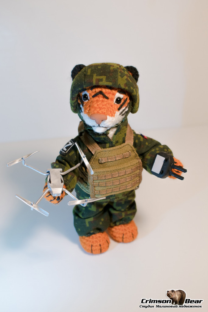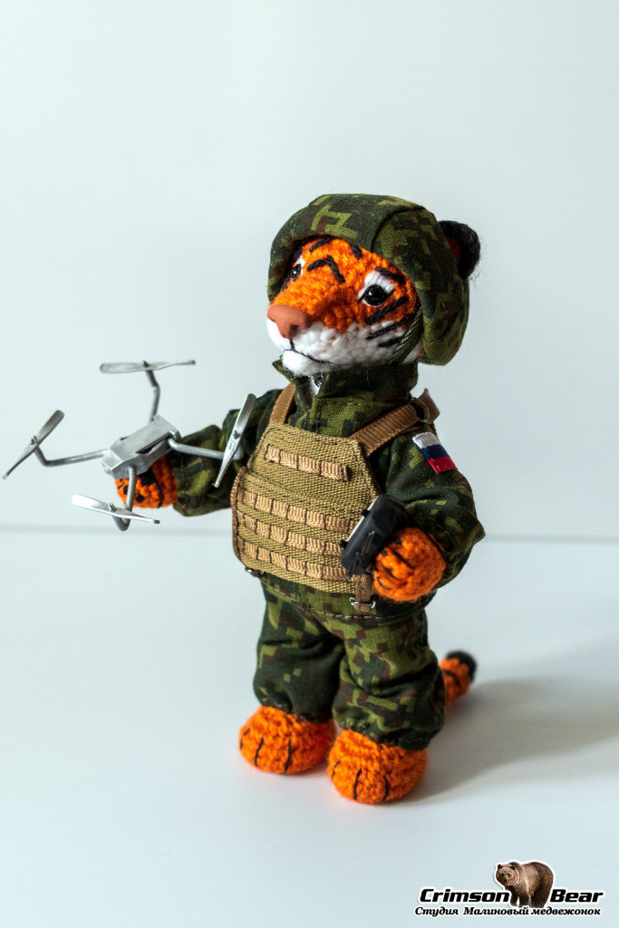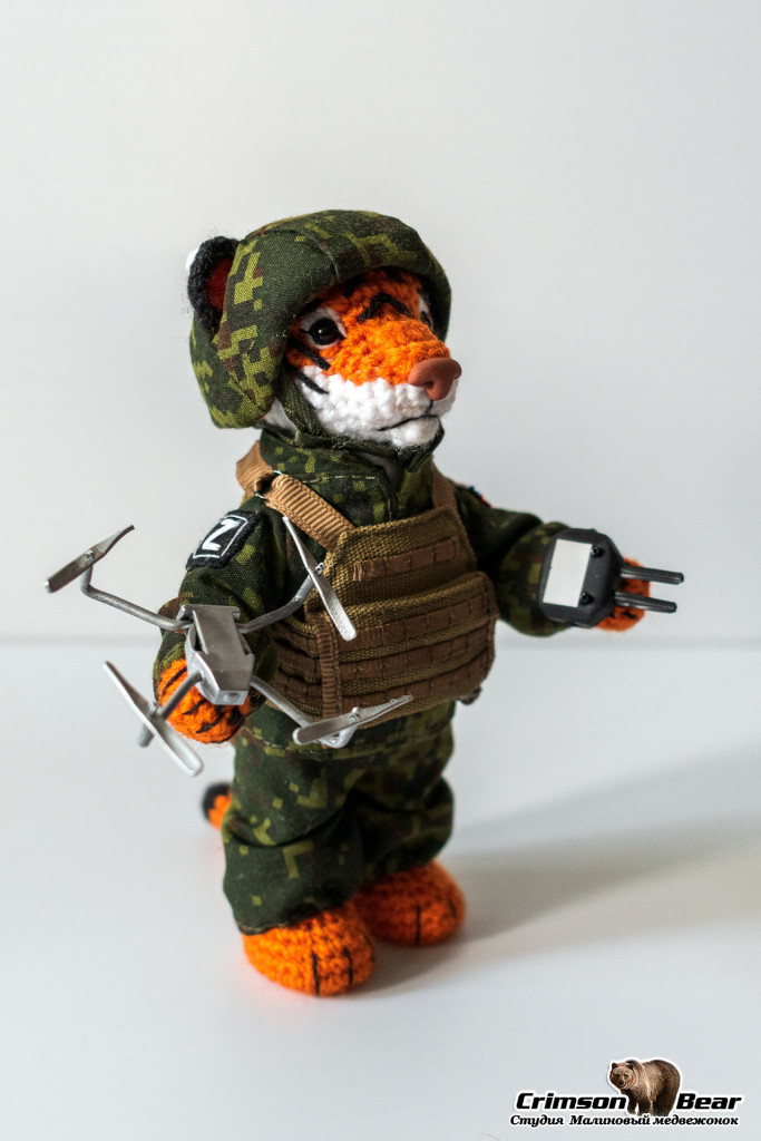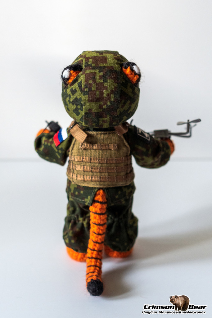 Размер тигра 15 см. Подвижная голова на шплинтовом креплении, лапы и хвост на меднопроволочном каркасе. Каска из композита, сверху камуфляжный чехол. Нашивки флаг РФ и Z.