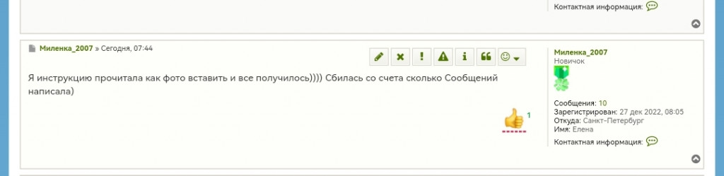 Молодец! Действуй по инструкции и всё получится) А сообщения свои можно посмотреть в профиле, и справа под будущей аватаркой Набрали 10 и уже не Гость, статус изменился)Миленка_2007 писал(а): ↑06 янв 2023 00:44 Я инструкцию прочитала как фото вставить и все получилось)))) Сбилась со счета сколько Сообщений написала)