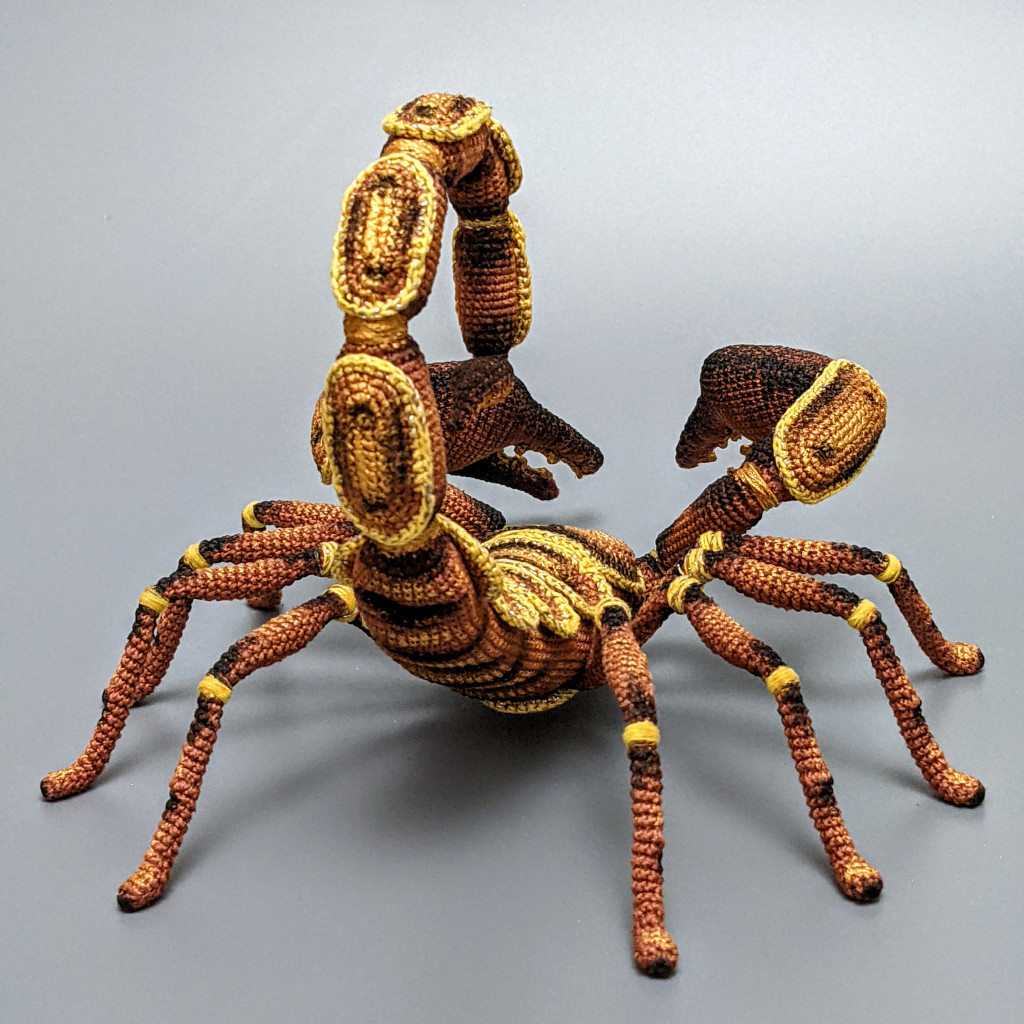 Скорпиончик фантазийный. Связан по особому случаю. Пряжа Пехорка Ажурная, крючок 0.75, каркас, немного YarnArt Camellia для украшения, тонировка акриловые художественные краски. Размах лапок около 20см. Ужасно понравилось вязать этого членистонога, уверена, что этот - только первый, будут ещё, только в другом стиле!))