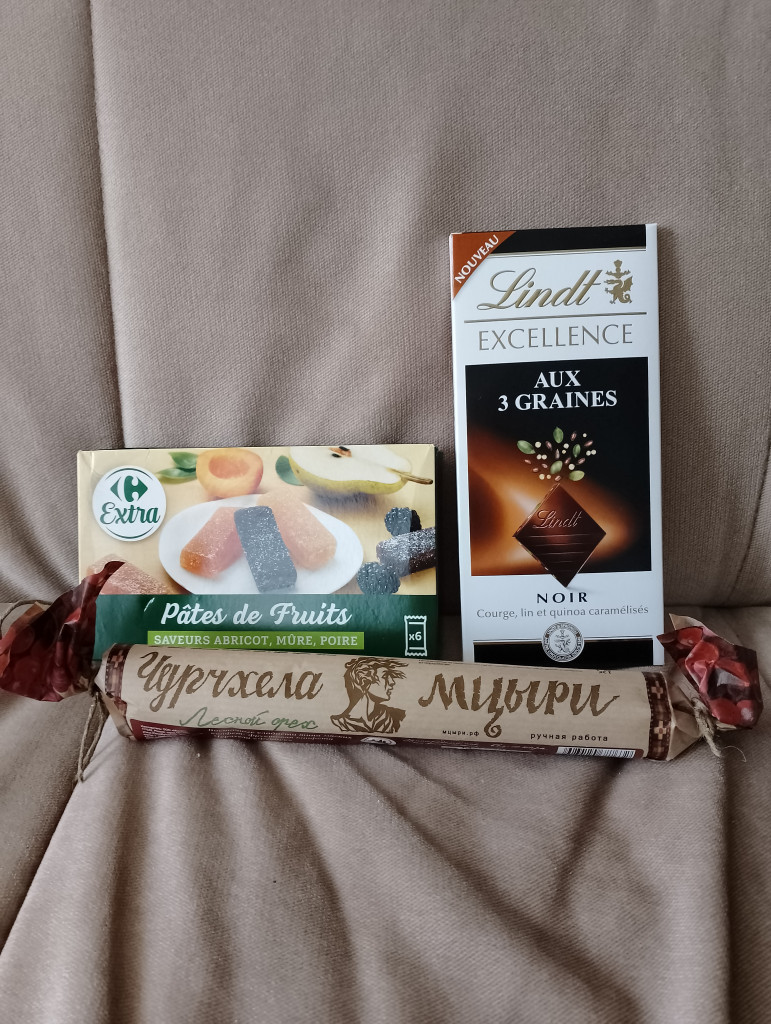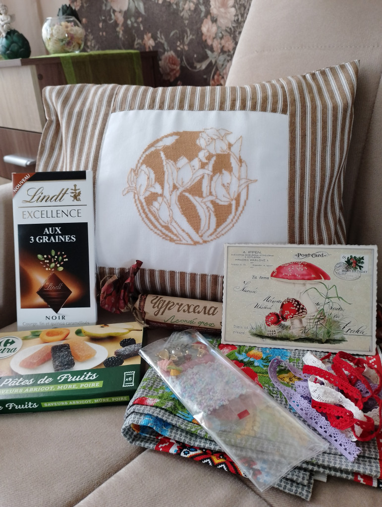 Видели фото в первом посте, где показан кусочек вышивки? А это моя новая наволочка Я так полагаю, что шоколадка и мармелад из Франции, да, Дина? И моя обожаемая чурчхела (обожаю её с любыми орехами и с любым вкусом) Вот такая посылочка ко мне приехала Диночка, спасибо за маленькие радости в моей напряжённой жизни и за то, что цветы были не вязанные