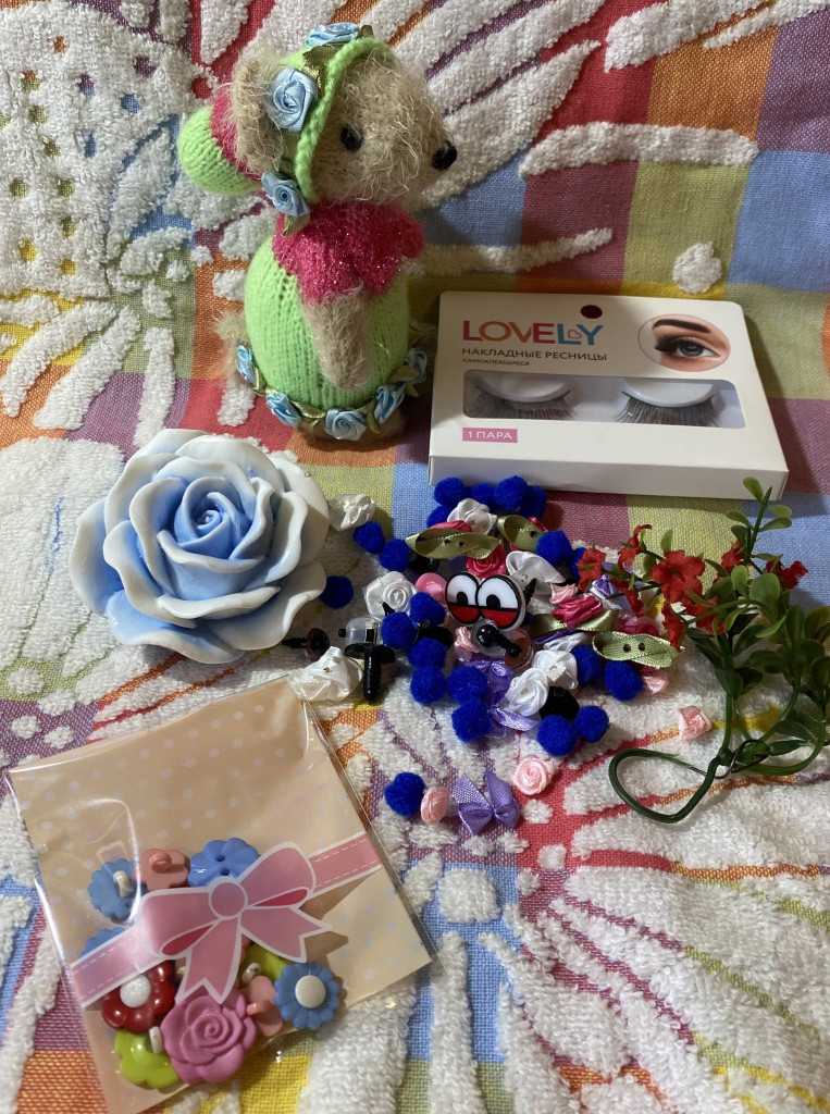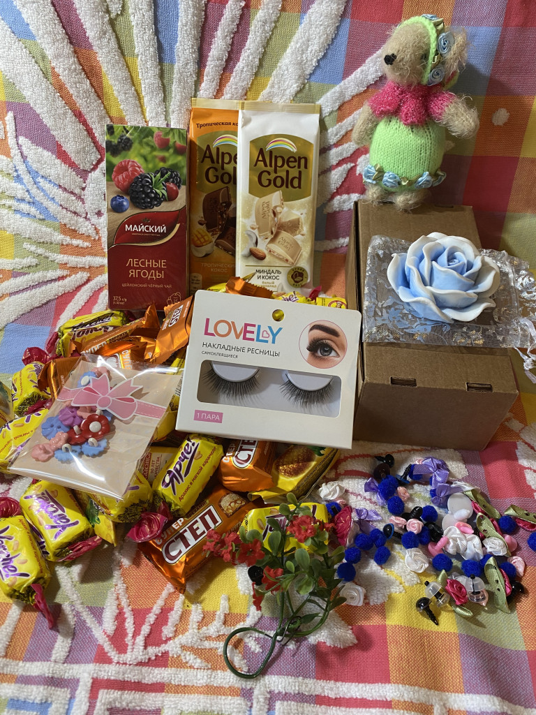 Почта удивила. Пришло уведомление и время работы до 9 вечера. Не поверила, но пошла. И ведь открыто. Так- то до 7, а так-то каждый день у них что-то новое, как у склеротиков. Приехала ко мне цветочная мышка. Я надеялась, что приедет именно она с моими любимыми голубыми розочками, спицевая, пушистенькая и в блестящем шарфе. А еще эта красавица привезла мыльце- голубую розу очень нежную и с ароматным запахом, пуговицы- цветы, ресницы, глазки, множество цветочков. Ну и, конечно, чай и сладости. Вот эта гора конфет меня не порадовала. Девушка я практически беззубая и сладкое стараюсь не есть. Такое разнообразие орехов, придется только смотреть как их поедает кто- то другой. Галина, спасибо за подарочки, за милую нарядную мышку - будет вдохновлять меня на новые свершения! Наташа, спасибо за интересный обмен.