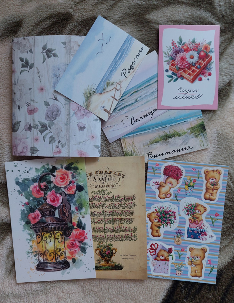 Сюрпризные открытки, цветочный фон, наклеечки с мишками. Моркие мини-открытки как раз хотела в свою коллекцию.))
