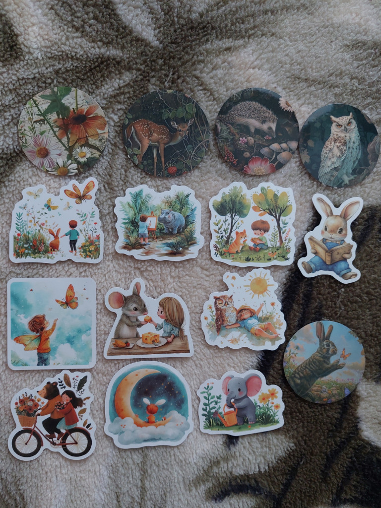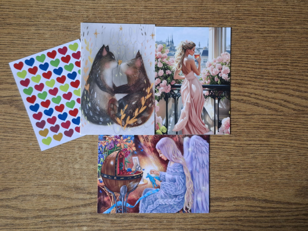 Конечно подарочки: открыточки, среди них ещё милый котик в коллекцию. :kat: Очень много красивых наклечеек.