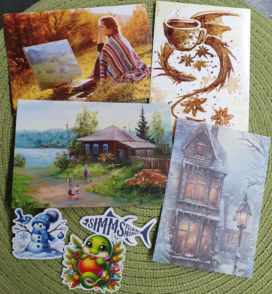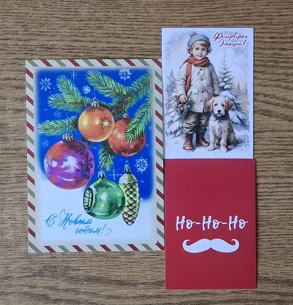 От @Madlena котик с балалайкой, я уж думала летняя потеряшка так долго гуляла (ведь в розыгрыши я такого выиграла, но не получила), а нет, это, думаю, Наташенька мне повторно выслала и новогодне подписала + еще новогодние открыточки, закладочка, наклеечки.