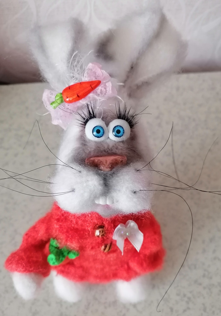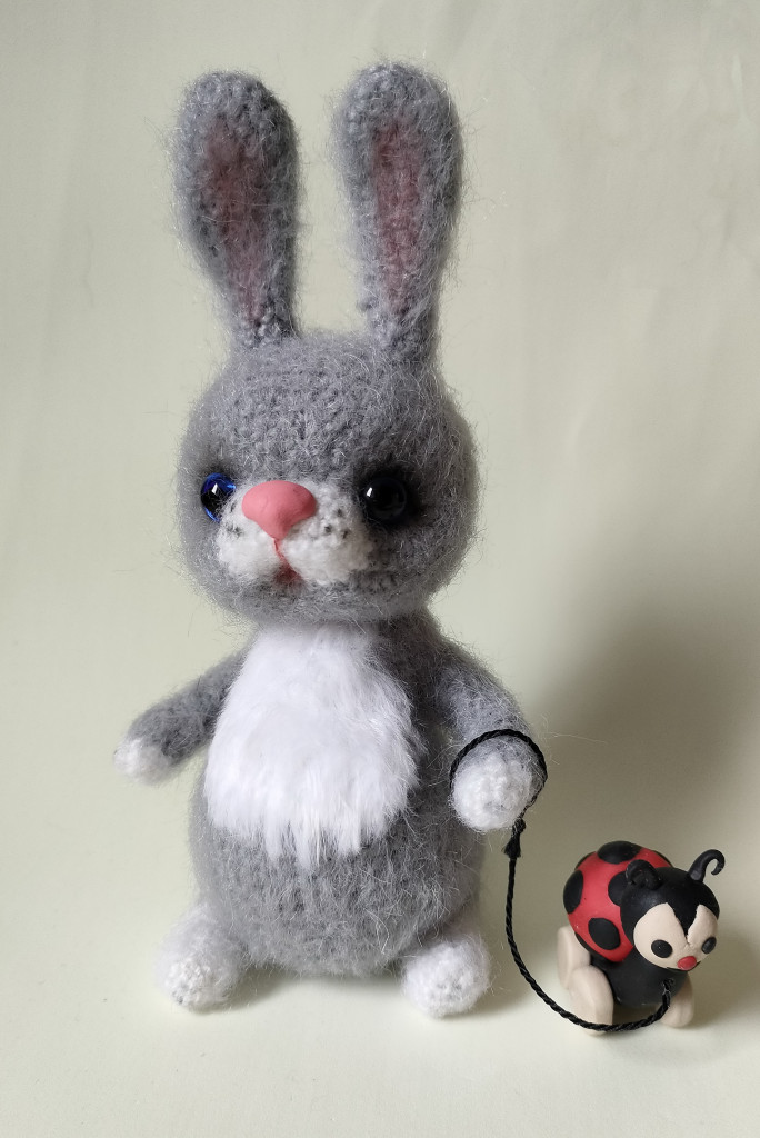 Зайчик по МК Светланы Перцевой. На проволочном каркасе, голова на шплинте. Божья коровка - каталка из запекаемой глины.