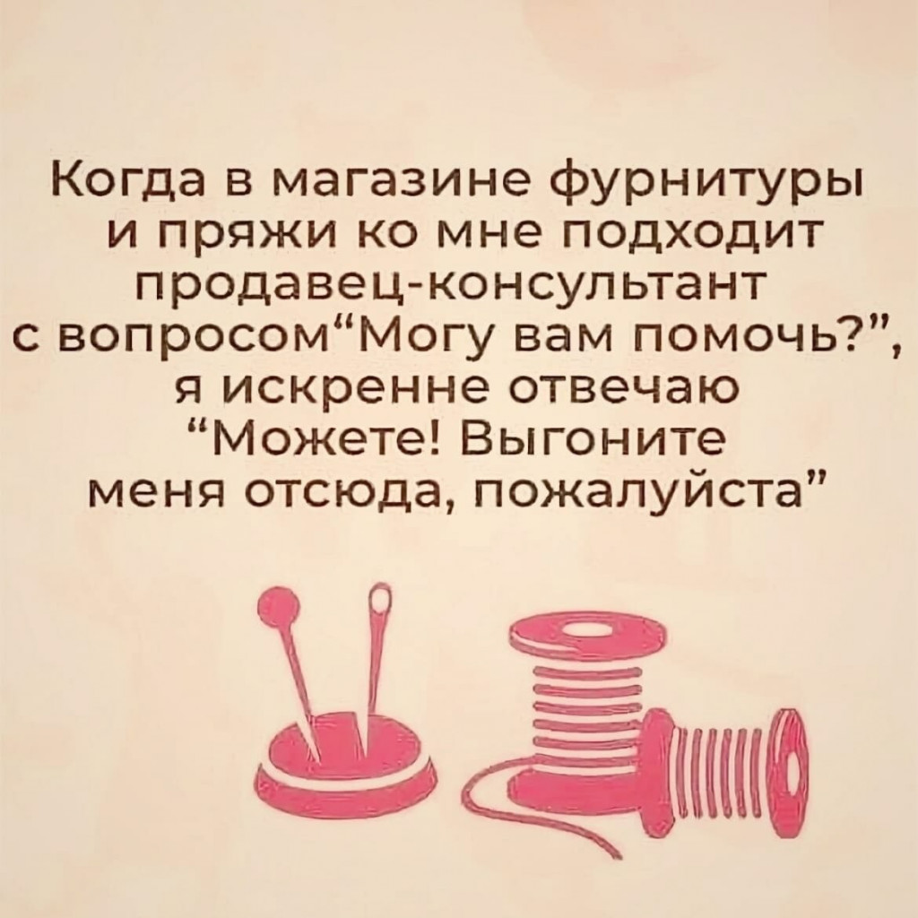 Рукоделие это болезнь которая передаётся путём распространения схем и МК. Когда в магазине товаров для рукоделия ко мне подходит продавец с вопросом ,,Чем я могу вам помочь ?",я искренне отвечу,, Можете!Выгоните меня отсюда ,пожалуйста "