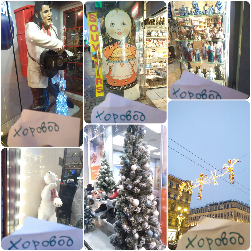 Но я придумала! Зашла в магазин сувениров на Невском, подошла к полкам с канцтоварами, нашла бумажку, на которой можно черкать ручками-карандашами , написала на ней свой" хоровод" оторвала и сунула в карман, а потом уже собирала персонажей хоровода - мишку, матрёшку, Элвиса Пресли)))