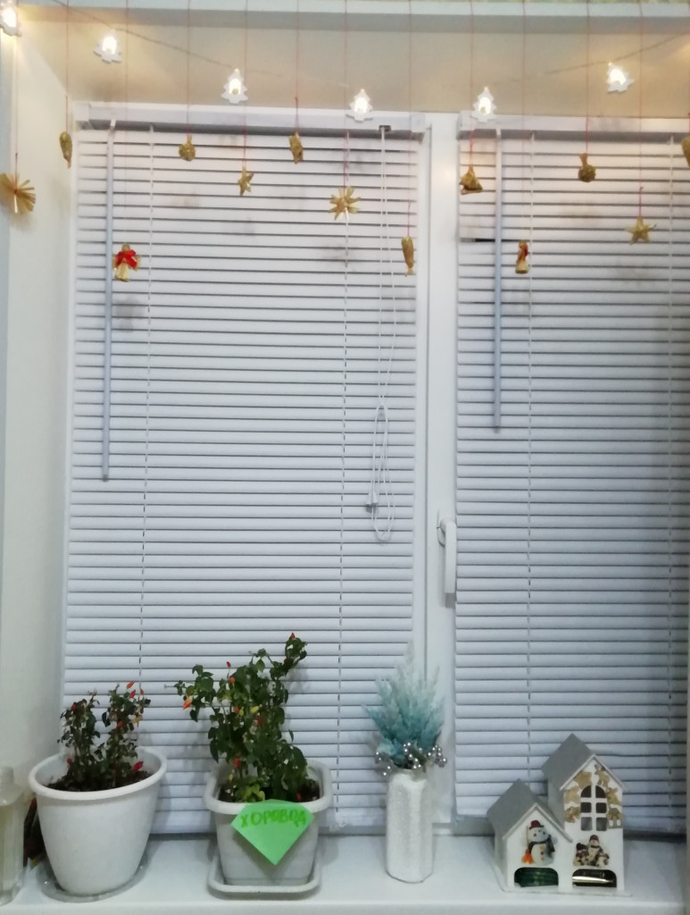 Как-то в нашей семье не принято украшать окна, да и в квартире не особо много украшений: ёлка большая, и 2 маленьких- на кухне и в спальне. Все окна заняты зимой цветами, которые заслоняют собой, практически всё стекло (с ранней весны до конца ноября они живут на балконе и очень радуются простору