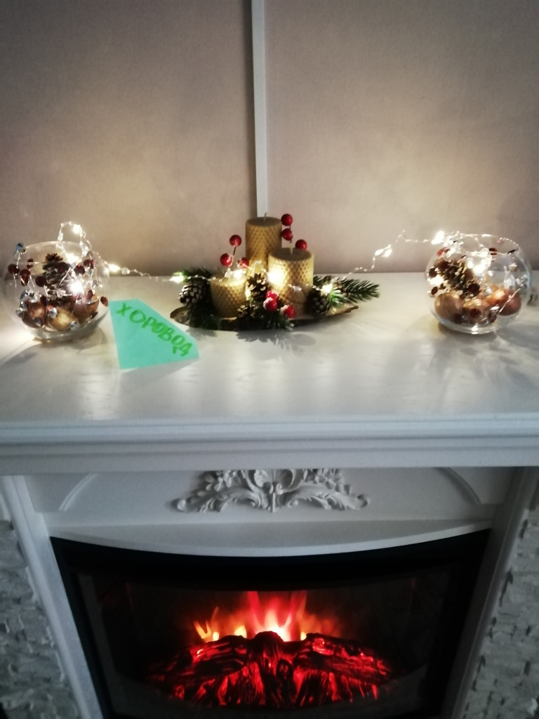 Украшаю только одно окно (на остальных вплотную стоят цветы). Основной декор идёт на камин (кто приходит в гости - все возле него фоткаются). . Ближе к новому году ещё на него прикрепляю матовую мишуру и банты (или шарики). Так же, ближе к новому году, выставлю композицию на комод.