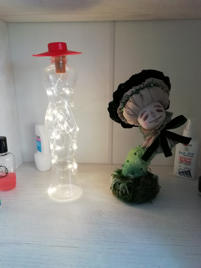 Тут ещё доча увидела пустую бутылку из-под ликёра и захотела туда засунуть гирлянду с пробкой (утащила к себе в комнату) Музыку слушала на работе - как раз много новогодних композиций играло. А сегодня полдня смотрела новогодние фильмы для подъёма настроения