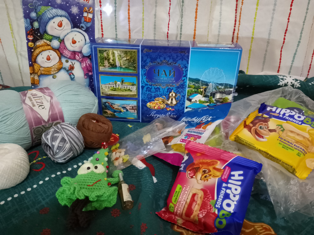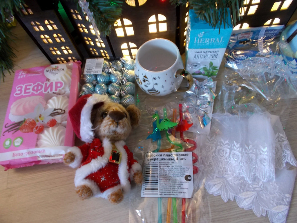Чудо-сладости, рукодельные прелести, красивая открытка, коробочка с чаем прямо оттуда)) т.е. с тёплого края нашей Родины. Ну и конечно она! Виновница торжества и новогоднего волшебства с моим любимым хулиганским видом и даже бутылкой (может так и не было задуманно, но я решила, что это ёлке).
