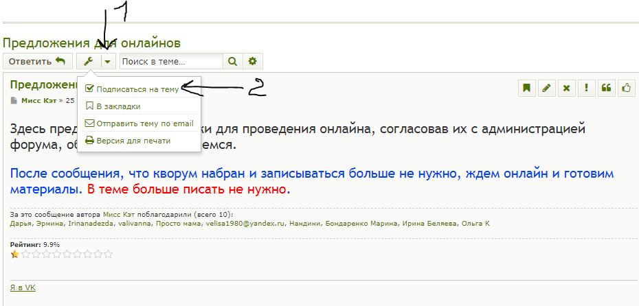 Заходите в тему, которая вам интересна. Нажимаете на треугольничек рядом со знаком гаечного ключа и "подписаться на тему.