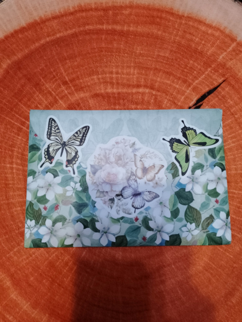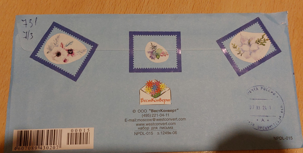 Пришлось искать канцелярский нож, так жаль было ножницами разрезать конвертик...все просто обалденное. Сам конверт красивый, на обороте наклеечки-марки. На лицевой стороне большая красивая марка