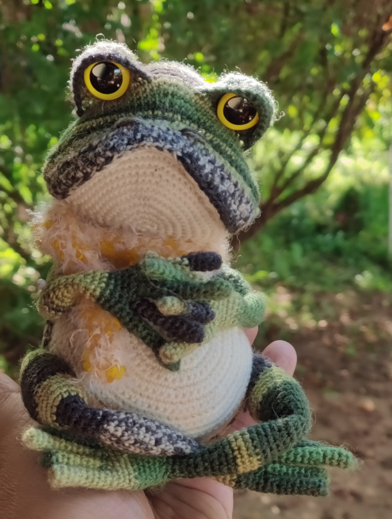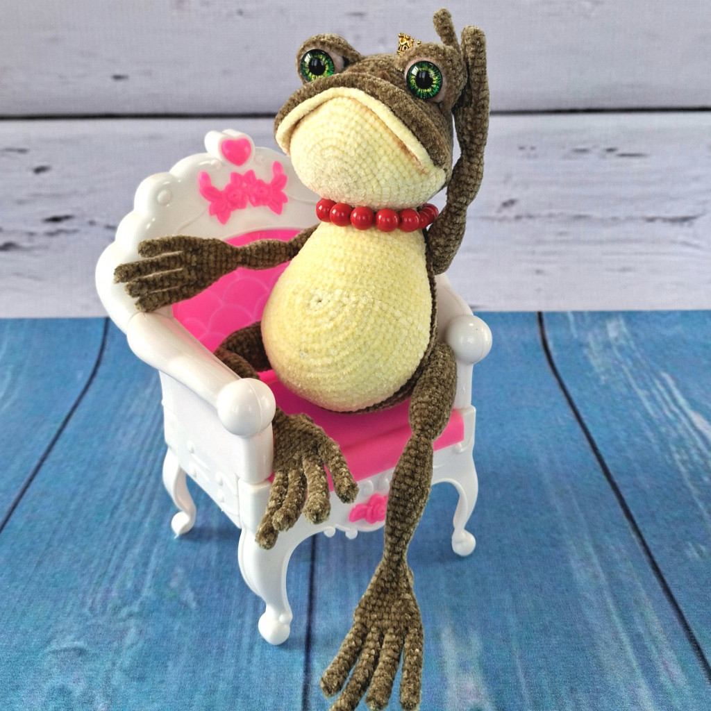 И вот еще одна лягушка, больше как демонстрация того, как делать не надо и лучше выбирать указанные нитки. Эта лягушенция вымотала мне все нервы и все равно не получилась такой, как я хотела и задумывала. В общем, примите к сведению, что из фактуры типа любой меховушки у вас получится вот такое странное существо)
