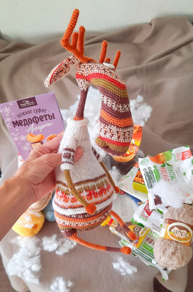 Как же я рада, что всё получилось! Этот лось сам выбрал себе пряжу (я ехала в отпуск между объявлением обмена и распределением ников, пряжу заказала к месту прибытия и совершенно не представляла, что вязать), сам попросился связаться (до этого я Лосября в полосках не представляла, сидела, думала: кто, что? И меня осенило - вот же он, только он!) Оказалось, что он угадал
