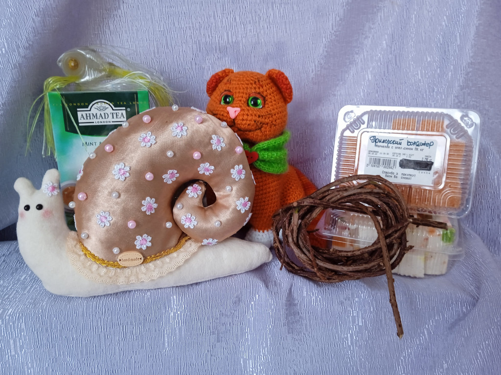 @OlgaS , я очень рада была побыть Вашей феей. Долго думала - думала, что может Вас порадовать, улиточка осенняя-но это же надо шить, а образа в голове не особо сложилось. И как-то всё так раз, и встало на место - надо добавить волшебства, сделать символы моих Вам пожеланий. И всё сложилось) Улиточка на удивление быстро сшилась, подождала, пока довяжется довольный жизнью рыжий кот и я очень, очень рада, что всё пришлось Вам по душе