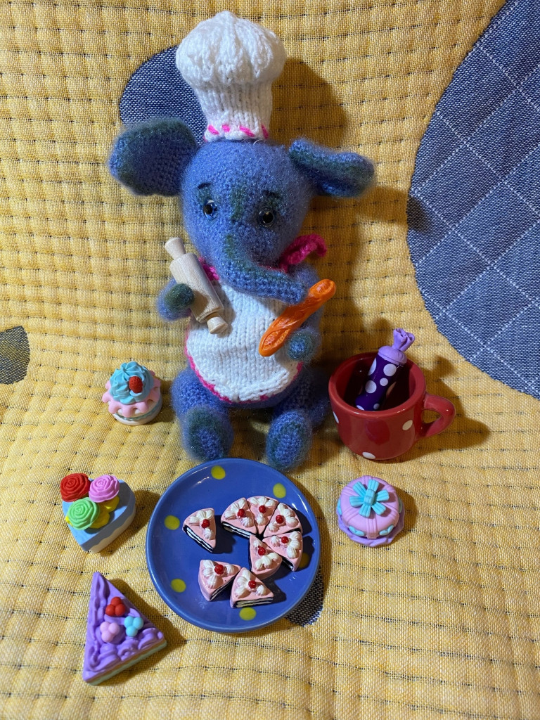 Вот и ко мне приехал изюм. Золотые руки Стэллы @Сладкоежкина связали для меня слоника, а изюмом была скалка. Вот слоник и примерил на себя роль повора. Приготовил много сладостей, и радостей и конечно привёз с собой.