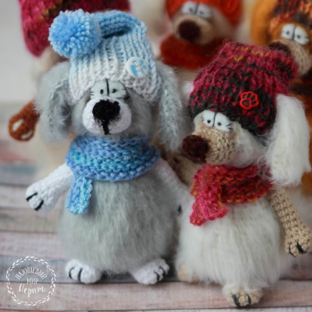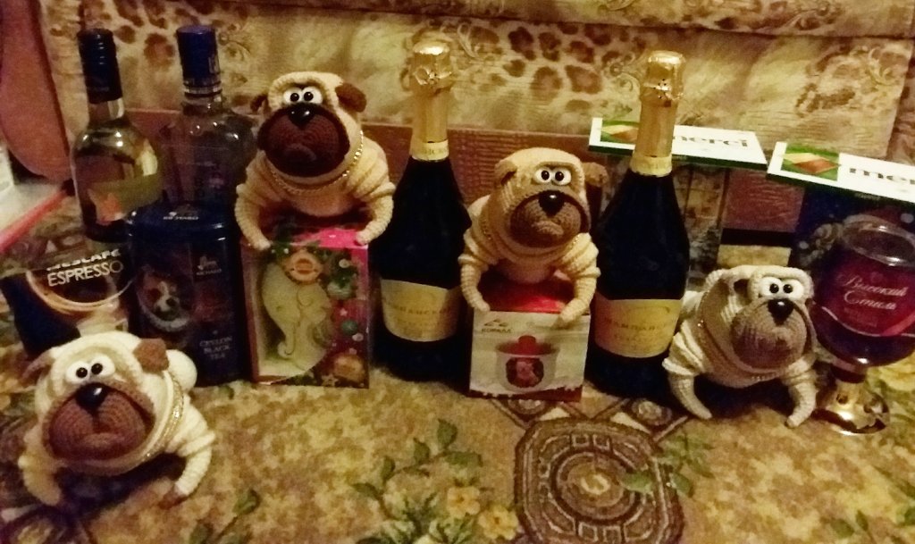 Мопсы, одни были связаны в подарок родным на новый год, другие были связаны в подарок бывшему коллективу