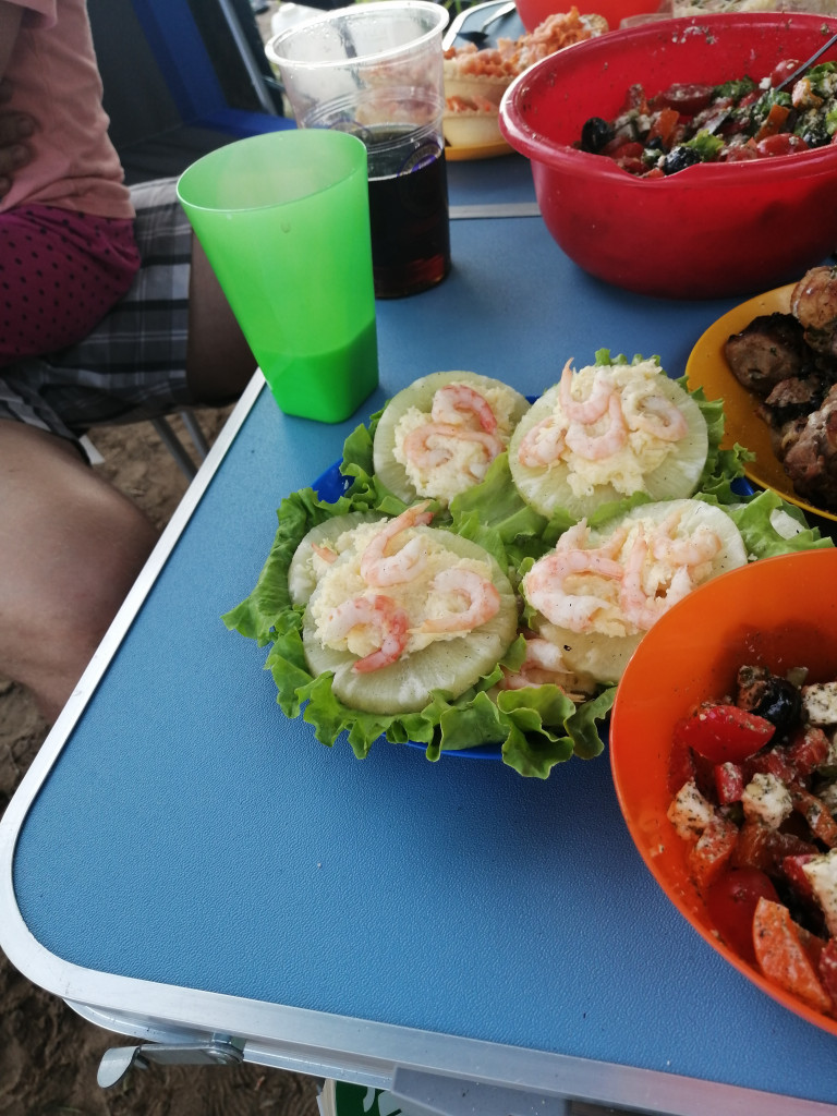 на лист салата кладется кольцо ананаса консервированного, креветка, сыр с чесноком. Очень вкусная закуска.